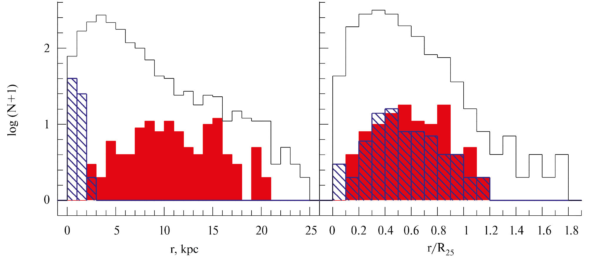 В оптическом диапазоне основным индикатором звездообразования служит эмиссионное излучение областей H II в линиях бальмеровской серии водорода, в первую очередь - в линии Hα. Ионизацию водорода вызывают наиболее массивные звезды, однако области звездообразования (ОЗО) моложе 1-2 млн лет не наблюдаются в оптике из-за очень большого поглощения в пылевом коконе, окружающем звездно-газовую группировку [12-14]. Время существования оболочки H II не превышает 8-10 млн лет.