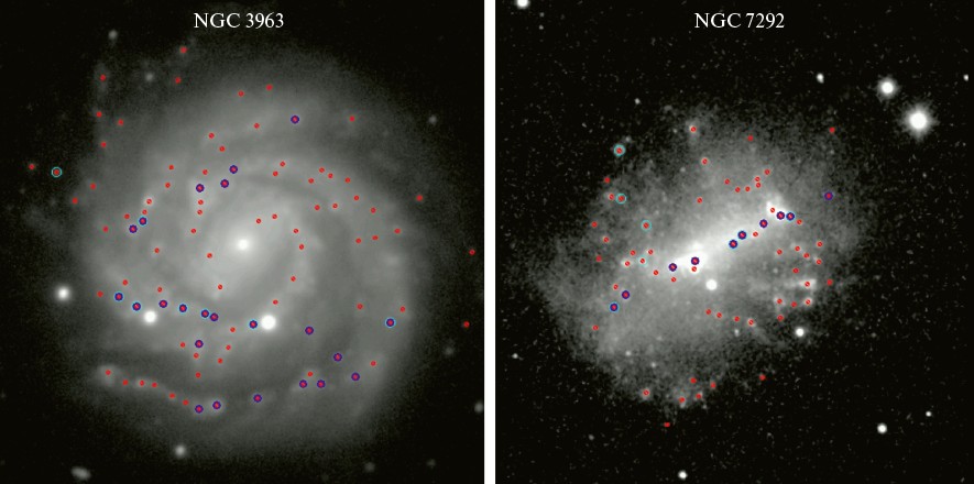 Рис. 1. Изображения галактик NGC 3963 (слева) и NGC 7292 (справа) в полосе B в логарифмической шкале интенсивностей. Красными маленькими кружками отмечены идентифицированные ОЗО, изученные фотометрически, синими кружками — ОЗО, изученные спектроскопически в работе [30], голубыми крупными кружками — ОЗО с полученными оценками массы (возраста) в данной работе. Размеры изображения NGC 3963 — 170.5' × 170.5', что соответствует линейному размеру 40.67 кпк, размер изображения NGC 7292 — 146.7' × 146.7' (4.85 кпк). Север — сверху, восток — слева. Центры изображений соответствуют центрам галактик.