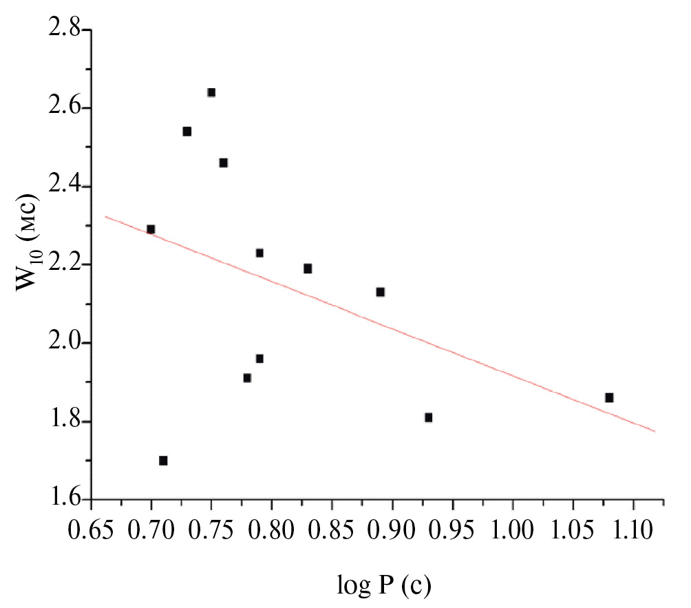 не согласуется с известной положительной корреляцией между W10 и P, вытекающей из представлений о формировании импульса в пределах открытых силовых линий дипольного поля, которые описываются в сферических координатах уравнением: