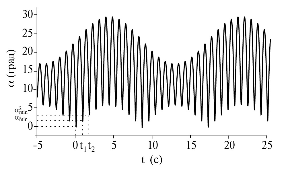 Рис. 5. Картина осциллирующего излучения [12] при ωdr = 2π /17 c–1, Ω = 2π / 0.85 с–1; t1 и t2 соответствуют двум последовательным периодам вращения P = 2π / Ω.