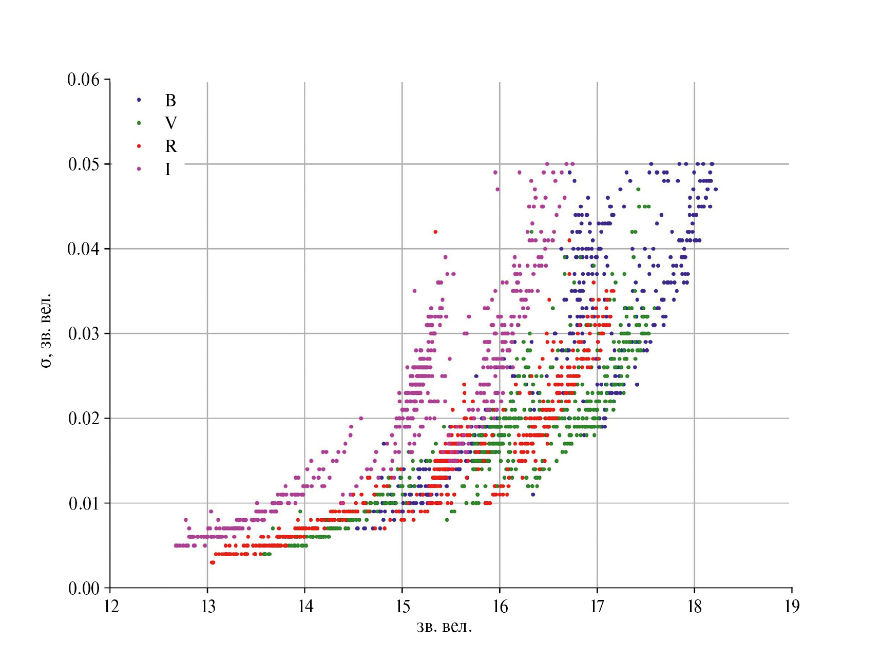 Рис. 2. Зависимость ошибок фотометрических наблюдений АСЗ на телескопе СБГ от видимой звездной величины в фильтрах B (синие точки), V (зеленые точки), R (красные точки) и I (малиновые точки).