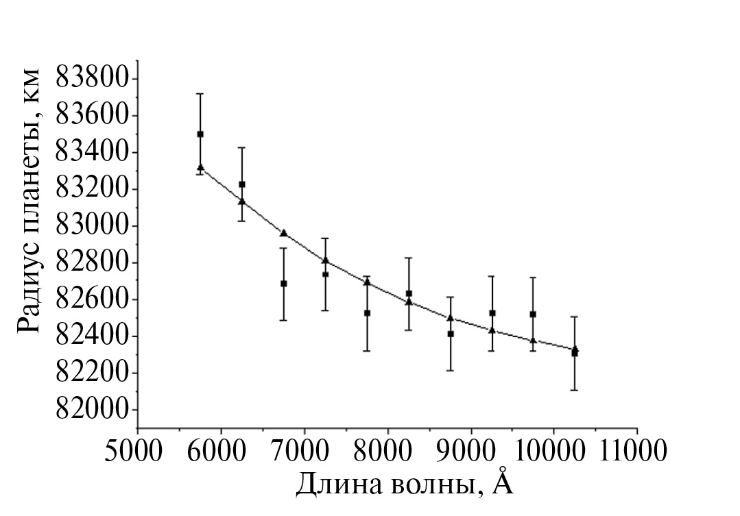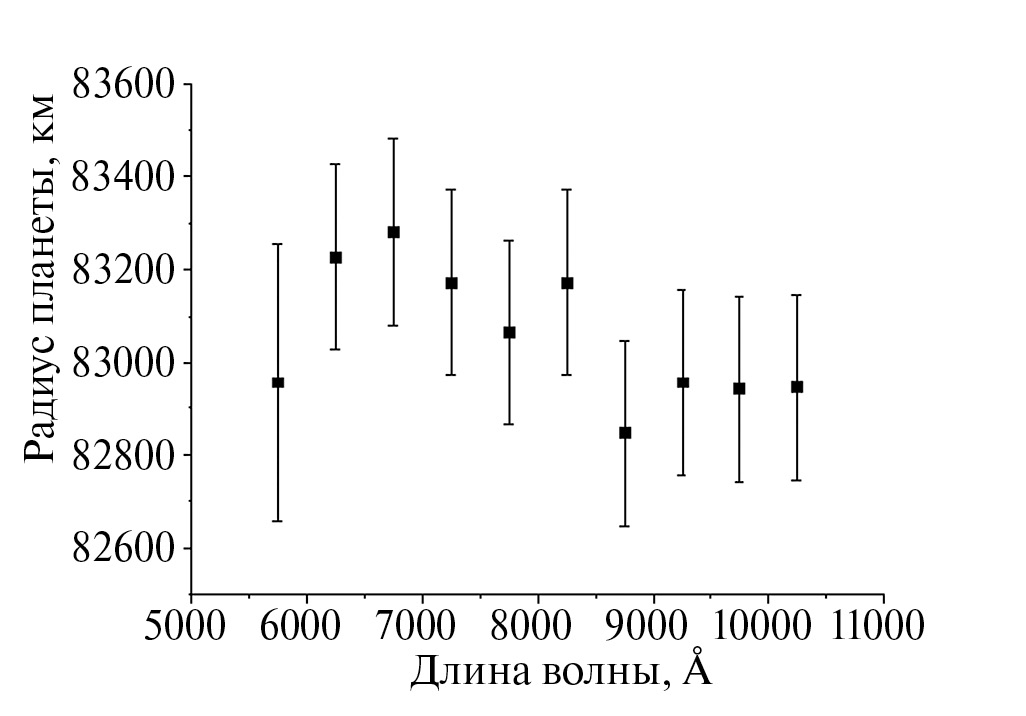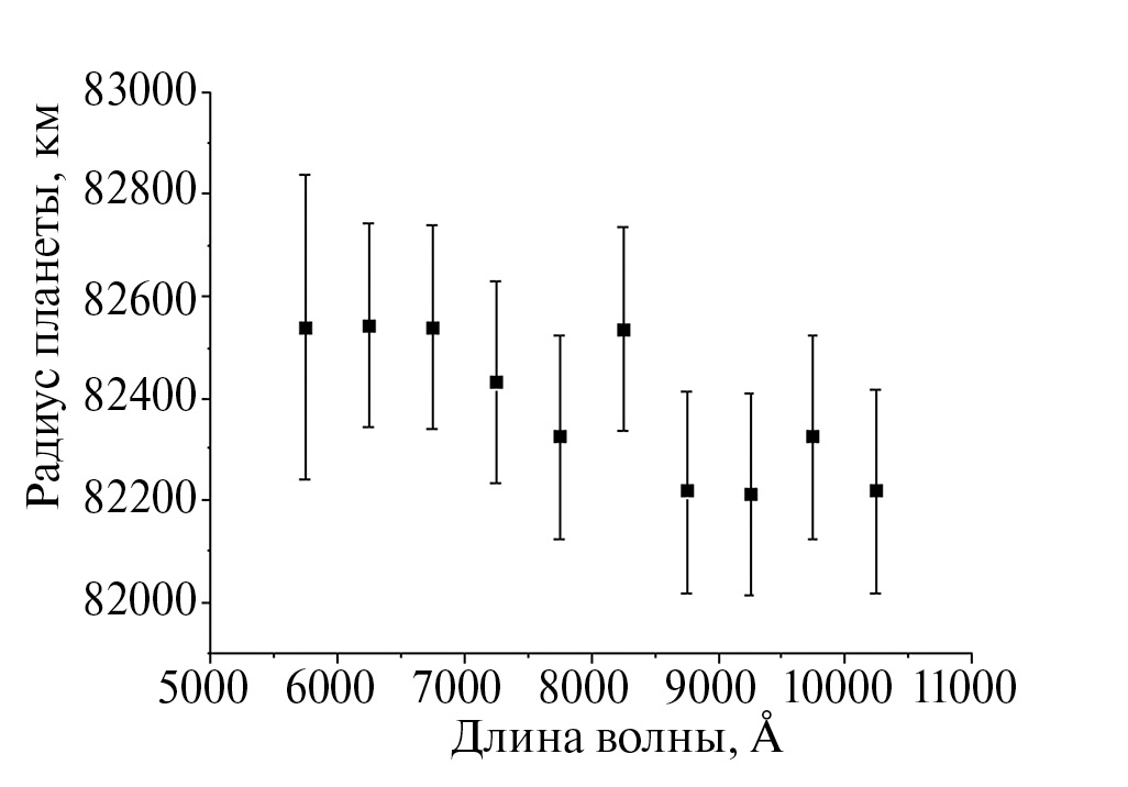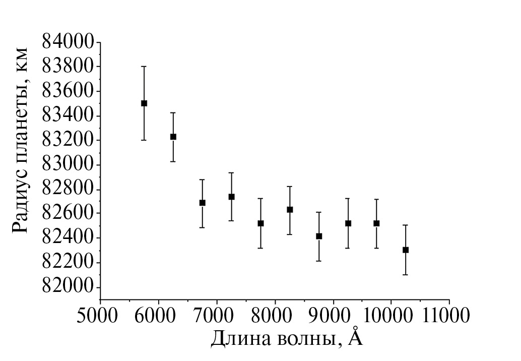 Еще одним результатом можно считать то, что в рассмотренной в данной работе модели характеристическая высота и радиус непрозрачной части планетарного диска были фиксированными для всех длин волн, в то время как коэффициент непрозрачности менялся от длины волны как , и при этом удалось получить эффективные радиусы планеты, а также их зависимость от длины волны, близкие к тем, что были получены из интерпретации наблюдательных данных (см. рис. 7–9). Это можно рассматривать как свидетельство возможности применения приблизительной модели рэлеевской атмосферы при определении характеристик атмосфер экзопланет из многоцветных фотометрических наблюдений.