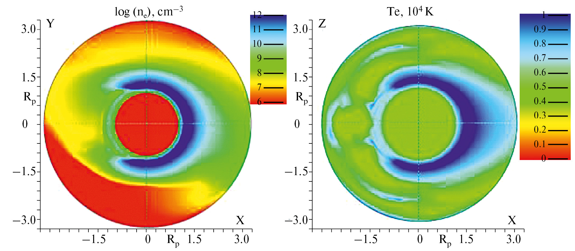 Рис. 2. Пространственное распределение в цветовой градации концентрации электронов (слева, логарифмическая шкала) в экваториальной плоскости. Масштаб представлен в радиусах планеты. Звезда находится за пределами рисунка в точке X = 36.3, орбитальная скорость планета направлена по –Y. Справа — распределение температуры в меридиональной плоскости. Расчет сделан с набором параметров N2.
