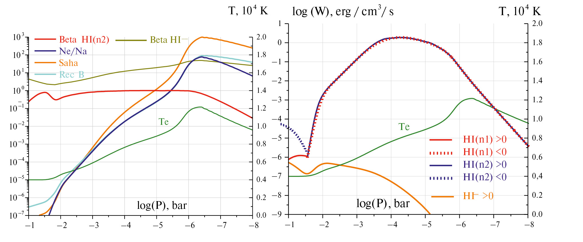 Популяция ионов HI – в общем случае не находится в ЛТР (см., например, [44]), и мы рассчитываем ее из соответствующих реакций, описанных в Приложении 2. В целом, основная роль HI – заключается в уменьшении непрозрачности плотного газа в VUV и оптической области, где поглощение другими элементами незначительно. На рис. 5 представлены профили, аналогичные рис. 2, но с учетом HI – . Видно, что фотоионизация HI – не вносит вклада в энергетический баланс. Основное отличие заключается в том, что в присутствии HI – температура повышается при давлениях <10 –3 бар более плавно. Причина этого была найдена в следующем. Имеется реакция нейтрализации HI – протоном с образованием возбужденного атома: HI – +p ↔ HI(n3) + HI(n1). Она имеет относительно большое сечение ≈10 –15 см 2 [45], поскольку протекает, для уровня n=3, с очень малым изменением энергии. Скорость обратной реакции, которая, по сути, является разрушением возбужденного состояния атома водорода в столкновении с невозбужденным атомом (HI в основном состоянии), может быть найдена из ЛТР соотношений. В плотной плазме с запертыми резонансными фотонами возбуждение из n=3 переходит в состояние n=2, то есть возбужденные состояния n≥2 можно считать находящимися в ЛТР соотношении между собой. Таким образом, скорость реакции HI(n2) + HI(n1) → HI – + p равна скорости для HI(n3), умноженной на коэффициент exp(– E 3,2 / kT ). По сути, популяция HI – сама по себе может быть не важна, но рассмотренная реакция может быть важна как канал разрушения возбужденного водорода.