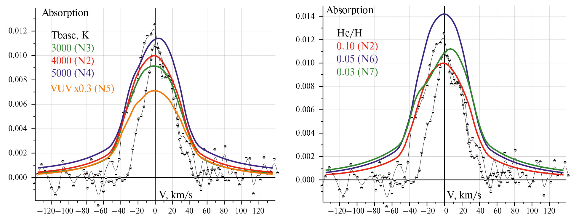 На рис. 6 (слева) показан профиль поглощения, полученный в моделировании с набором параметров N2 (красная кривая). Как видно, максимум поглощения достаточно близок к измеренному. Однако ширина профиля заметно больше ( FWHW =68 против 39 км/с), и наблюдается поглощение на крыльях линии, связанное с естественной шириной (профилем Лоренца). Отметим, что отрицательные ионы водорода заметно уменьшают крылья поглощения за счет поглощения в континууме, но не устраняют их полностью. В задаче имеются параметры, которые могут отклоняться от принятых величин: температура нижней атмосферы, содержание гелия и интенсивность излучения звезды в VUV диапазоне. На рис. 6 для сравнения приведены профили поглощения для разных значений этих параметров.
