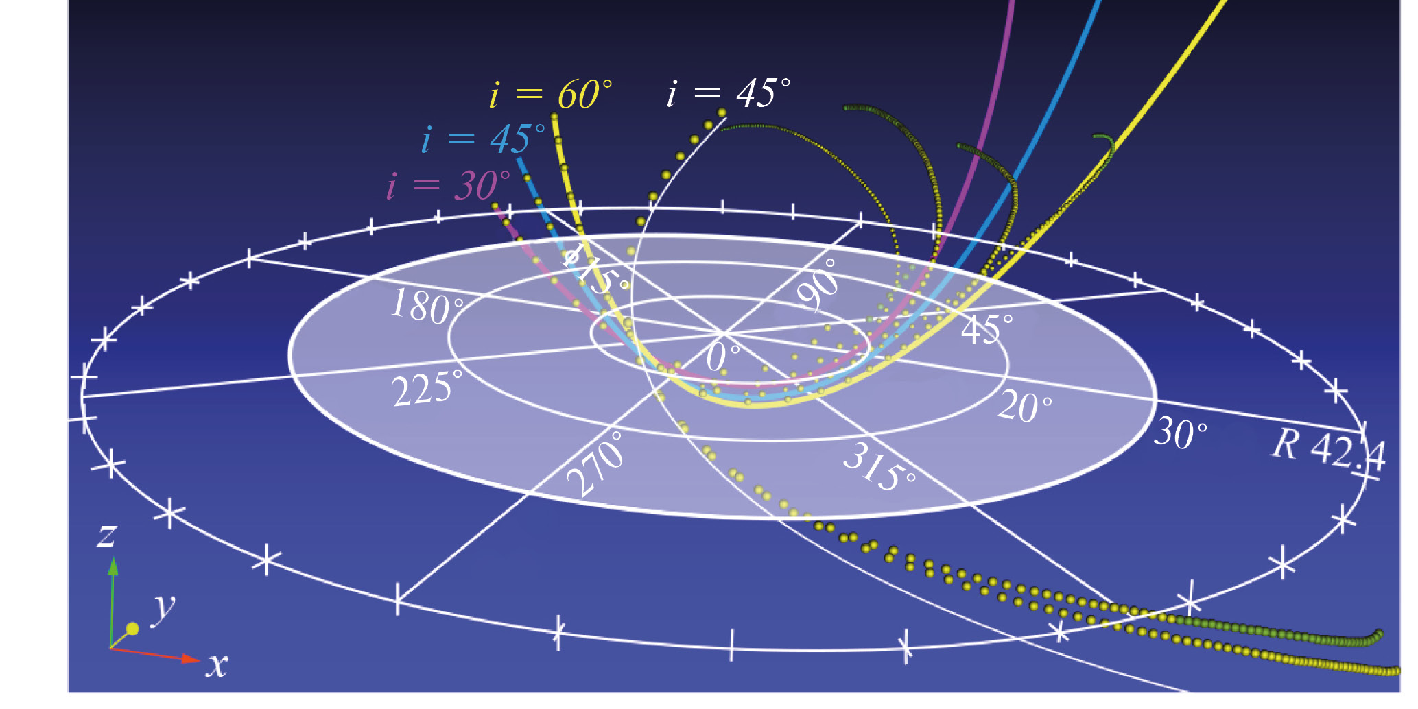 Столкновение такого сгустка с протопланетным диском протозвезды или другой звезды в плотном звездном скоплении должно привести к искажению плоскости диска в области его падения, что, в свою очередь, может способствовать формированию планеты на наклонной орбите. Последствия такого падения были исследованы в работах [42, 43, 44]. Предполагалось, что сгусток и диск достигли теплового равновесия. Рассматривалась задача распада дугообразного возмущения с наклоном начального вектора скорости относительно плоскости диска во вращающейся среде диска в предположении мгновенного и дискретного падения струи газа.