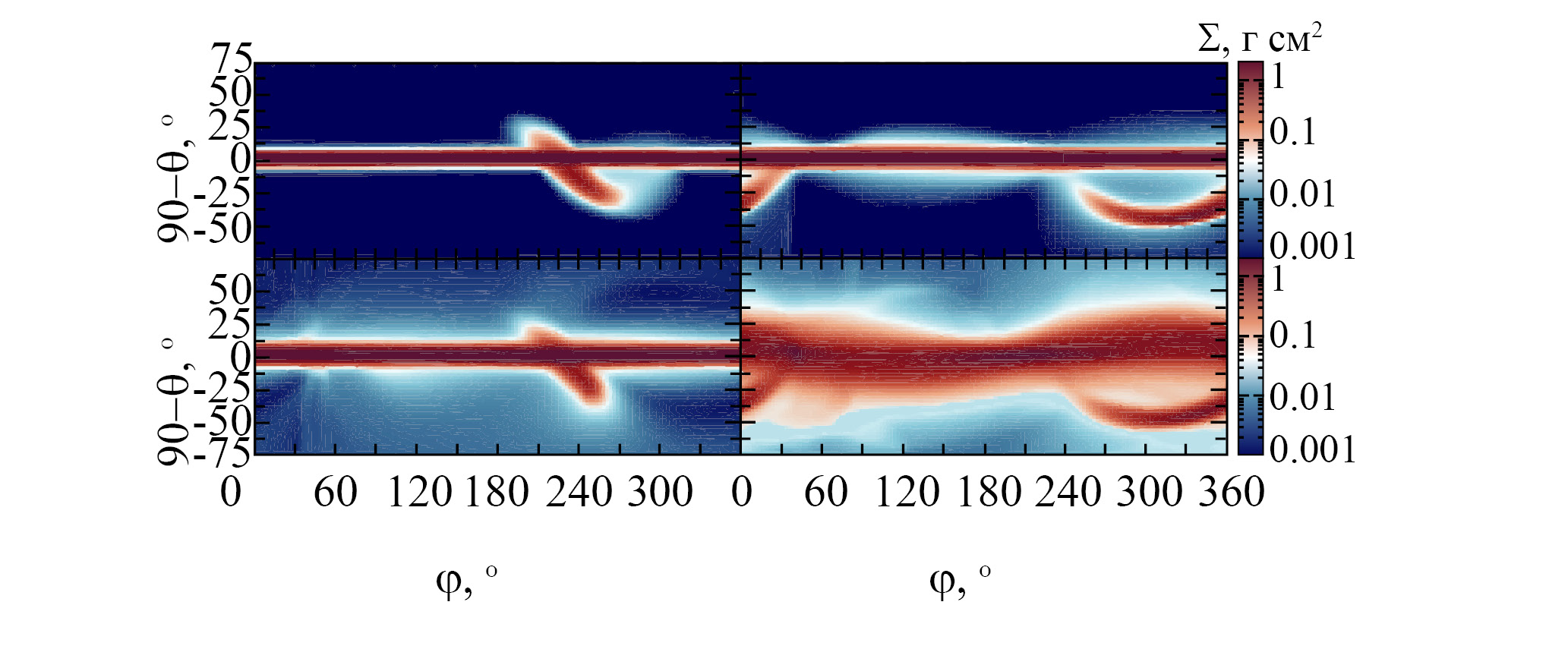 Параметры расчетов подбирались так, чтобы первое пересечение плоскости диска центром масс падающего вещества было примерно в одном и том же месте а. е., 0°, 225°).