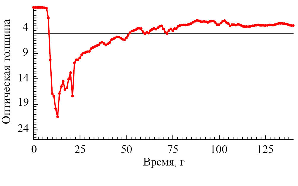 Следует отметить, что в данных расчетах не учитывался перенос излучения. Результаты расчетов показали, что после столкновения вещества струи с диском происходит нагрев газа до нескольких тысяч градусов Кельвина в области столкновения вследствие адиабатического сжатия. Затем нагретая область растягивается в спираль кеплеровским вращением диска и распространяется на периферию диска, прогревая его. К моменту времени 150 лет спиральная структура располагается в пределах радиуса 45 а. е. Таким образом, перенос тепла происходит со скоростью а. е. за лет. В работе [73] показано, что характерное время тепловой релаксации вещества диска массой под действием радиативных процессов на расстоянии 7.5 а. е. составляет года и убывает с ростом расстояния и температуры. Таким образом, диск должен эффективно охлаждаться излучением. Тогда, как было отмечено в работе [72], вспышка аккреционной активности звезды, вызванная падением сгустка на диск, также должна сопровождаться усилением инфракрасного излучения из возмущенной области диска.