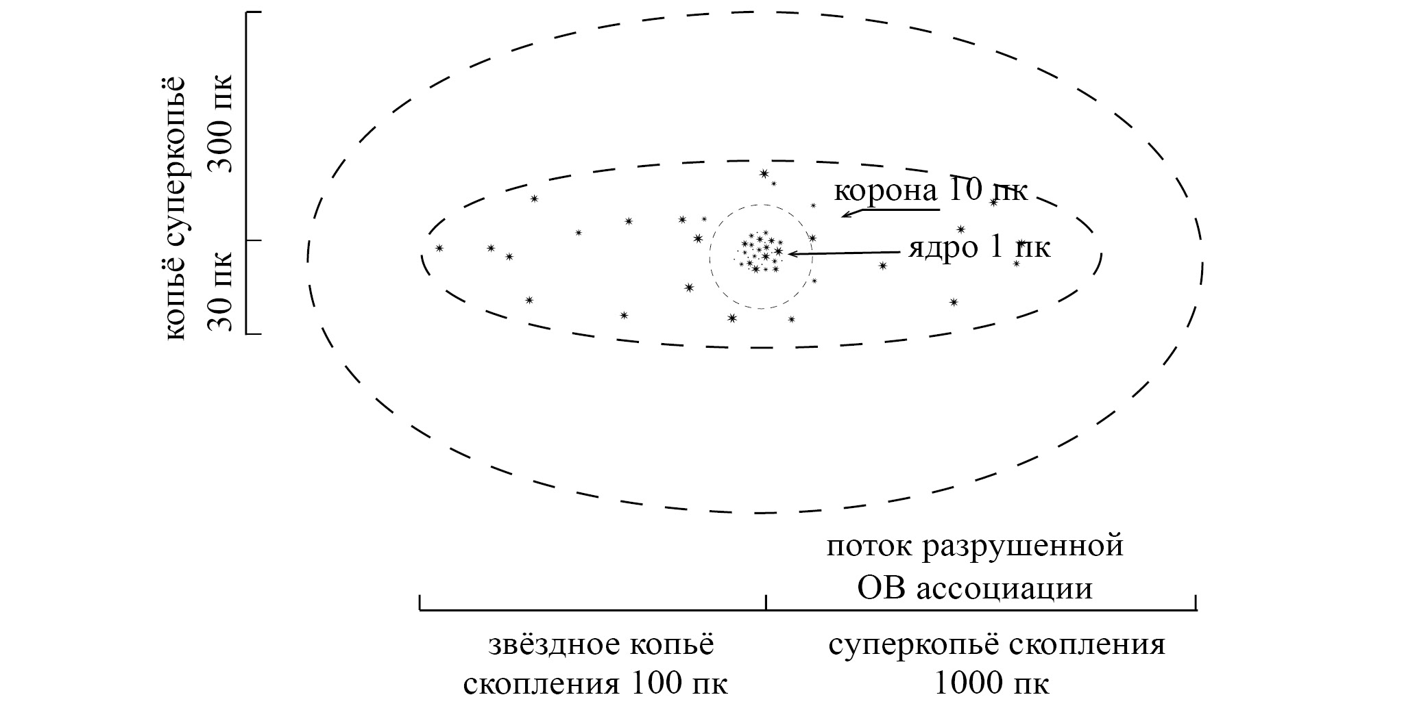 Рис. 1. Структура рассеянного звездного скопления. Схематично показаны ядро и корона скопления. Звездный поток или приливной шлейф [5759], состоящий из покинувших скопление звезд, показан штрих-пунктиром. Длина потока может достигать ~1000 пк.