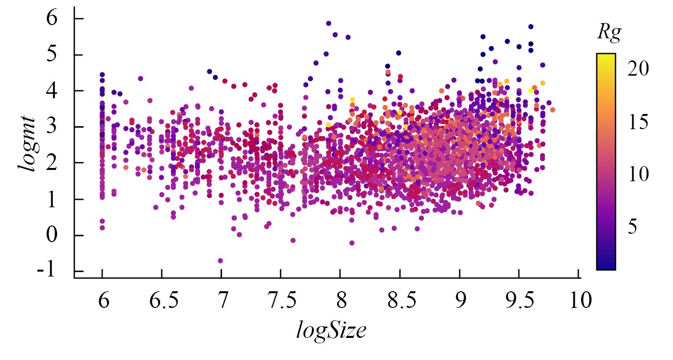 Это соотношение справедливо и для ГМО с массами 10106 при двух-трехкратной дисперсии радиусов [26]. Близкое соотношение позднее было найдено для Большого Магелланова Облака [27, 28]. Звездные скопления «наследуют» соотношение (2), связующее их с ГМО в качестве начального [2935]. Возможное объяснение соотношения (2) эффект наблюдательной селекции при определении границы ГМО и звездного скопления по проективной плотности ρR = const или M~R2. Оценка показателя степени соотношения (2) по наблюдениям имеет точность ±0.3.