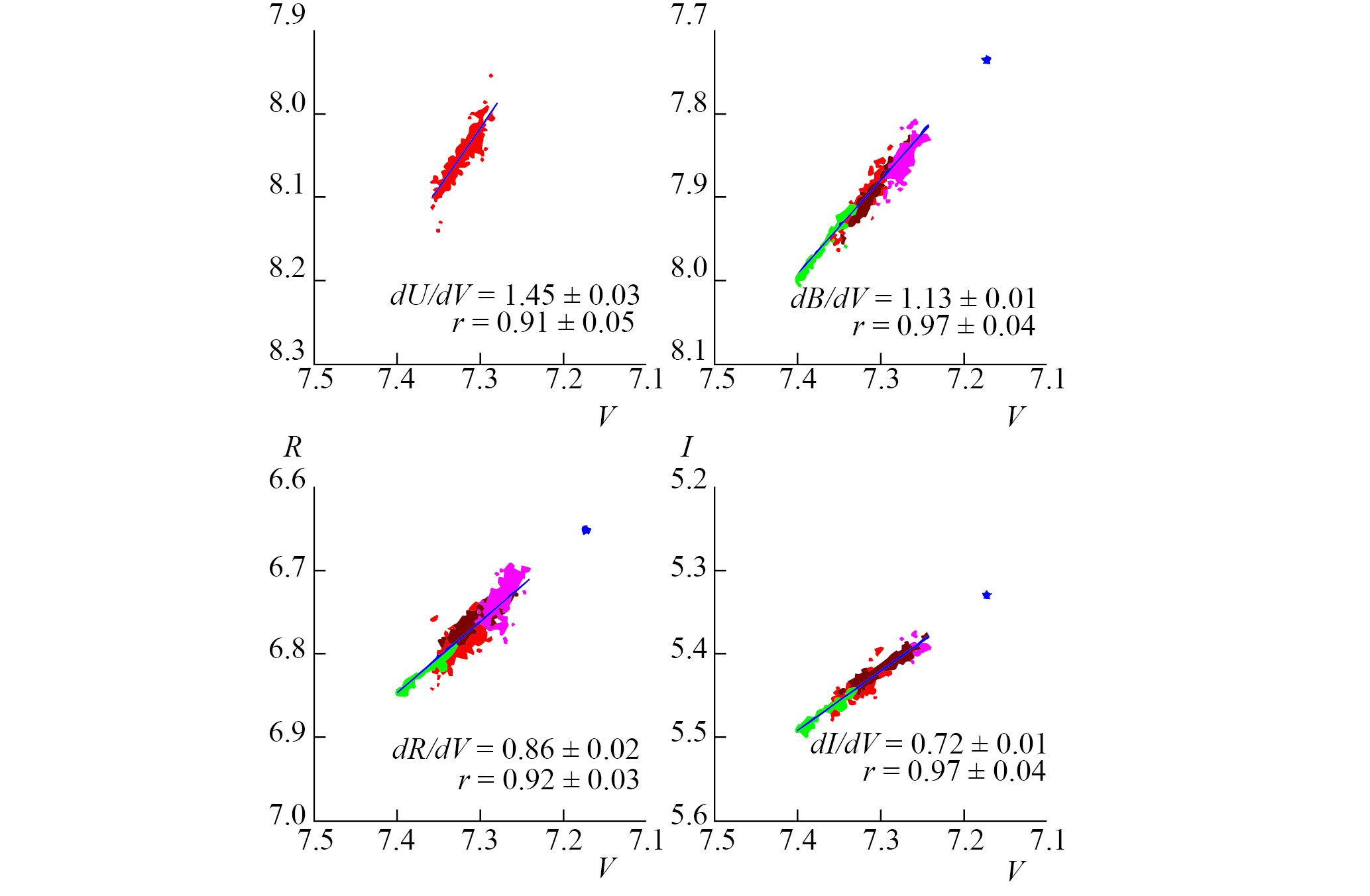 Анализ фотометрической переменности в полосах UBVRI вне затмений показал, что звезда краснеет при ослаблении блеска, и изменения блеска в полосах UBRI за все время наблюдений линейно зависят от изменений в полосе V (рис. 3). Такой характер фотометрической переменности наблюдается у всех известных запятненных звезд независимо от эволюционного статуса и связан с постоянной температурой источника переменности – пятен. Мы будем рассматривать коэффициенты наклона прямых U(V), B(V), R(V), I(V), которые практически совпадают с отношениями амплитуд переменности в разных полосах. Эти значения составляют: