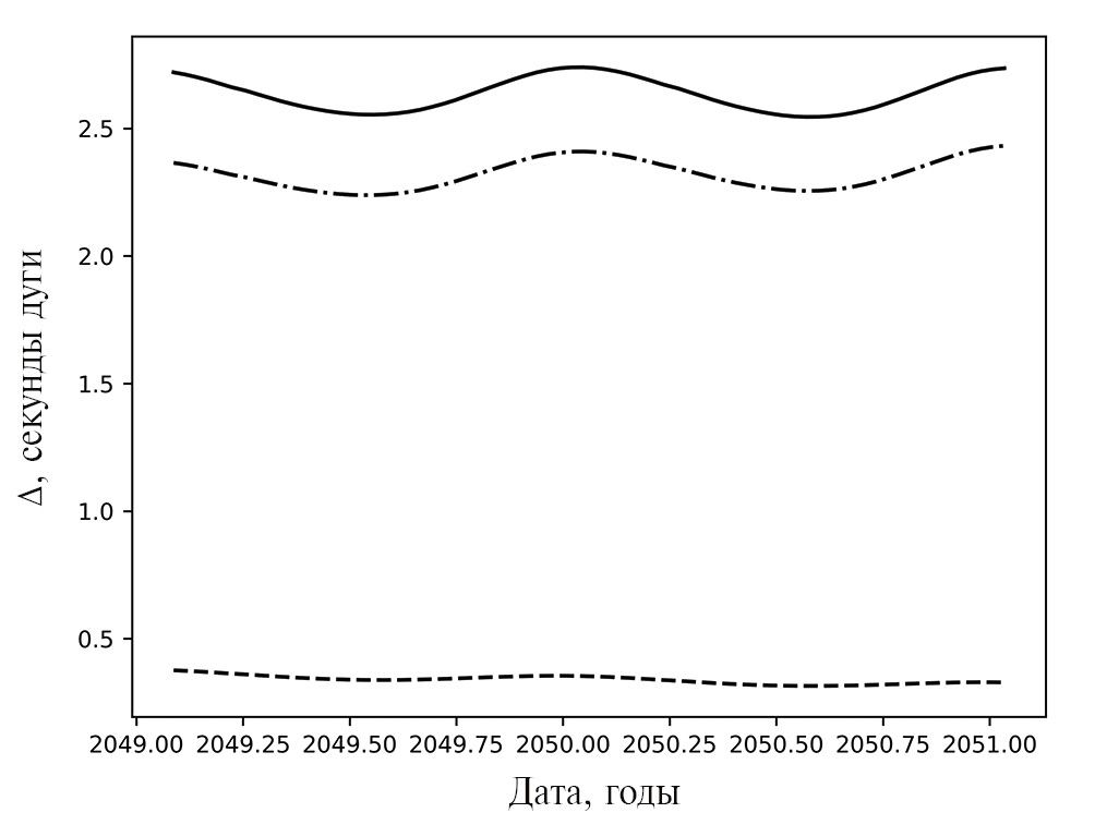 Рис. 5. Расстояние между эфемеридами положения на небе планеты Нептун в теориях INPOP, EPM и JPL DE на интервале времени с 01.01.2049 по 01.01.2051. Сплошной линии соответствует разность EPM–INPOP, штрих-пунктирной линии — разность EPM–DE, штриховой линии — разность DE–INPOP.
