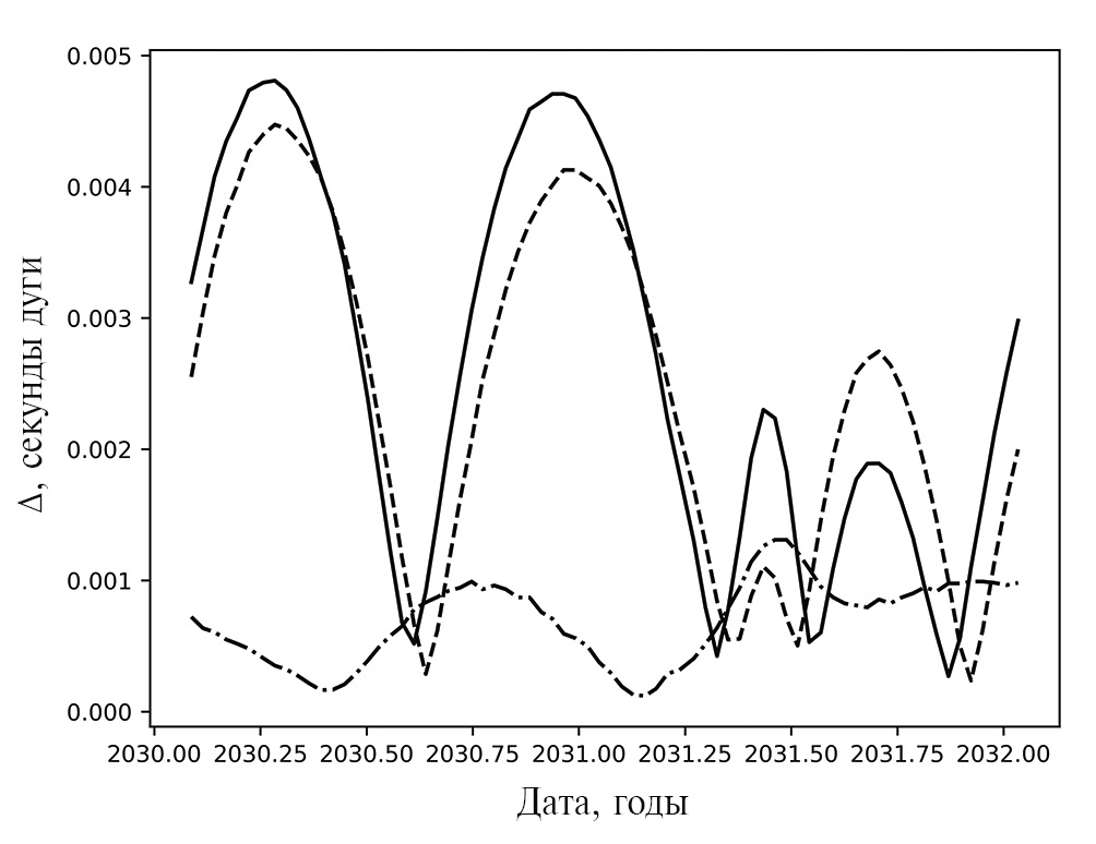 Рис. 3. Расстояние между эфемеридами положения на небе планеты Юпитер в теориях INPOP, EPM и JPL DE на интервале времени с 01.04.2030 по 01.04.2032. Сплошной линии соответствует разность EPM–INPOP, штрих-пунктирной линии — разность EPM–DE, штриховой линии — разность DE–INPOP.