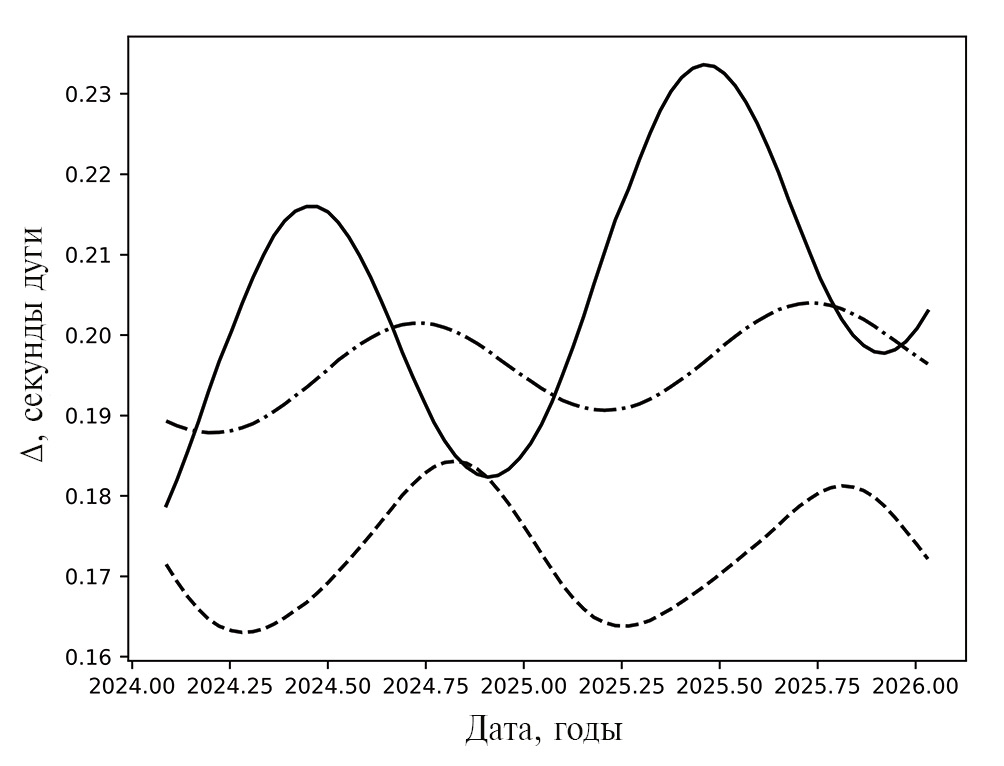 Рис. 1. Расстояние между эфемеридами положения на небе Солнца в теориях INPOP, EPM и JPL DE на интервале времени с 01.01.2024 по 01.01.2026. Сплошной линии соответствует разность EPM–INPOP, штрих-пунктирной линии — разность EPM–DE, штриховой линии — разность DE–INPOP.