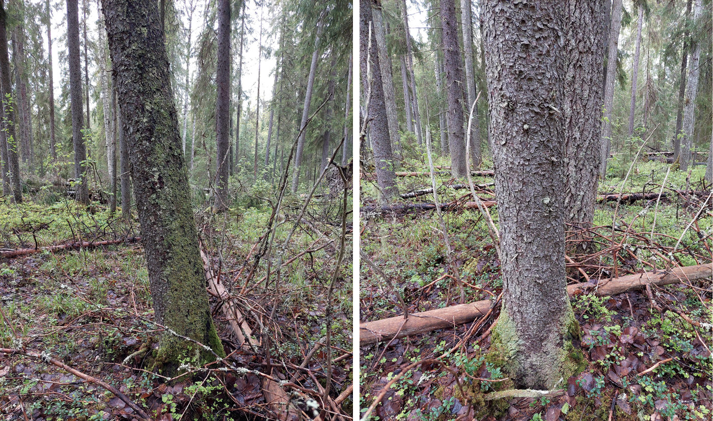 The paper presents the results of a study of the spatial structure of the distribution of epiphytes on the sample plot, and on the trunk of Picea abies (L.) H. Karst. The distribution of all trees and individual species on the sample plot, as well as most species of epiphytic mosses, does not differ from random. Only one species, namely Dicranum fuscescens Turner, which in this community grows only on the trunks of living trees, has an aggregated distribution, while all other epiphytic moss species are also found in the ground cover and their distribution in the communities is random. The epiphytic cover on the trunk of a spruce tree, in the conditions of the middle taiga blueberry spruce forest, has a structure consisting of stripes and spots of various types distributed along the humidity gradient.