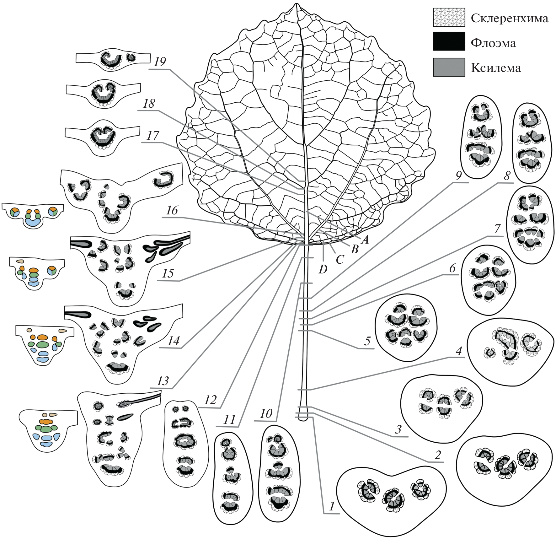 A study of the conductive elements arrangement throughout the petiole length and in the midrib of the Populus tremula leaves was carried out. The plants growing wild in Perm and artificially planted in residential areas were studied. It was found that the shape of the petiole cross-section varies throughout its length from broadly heart-shaped (at the distal end) to strongly flattened laterally (at the leaf blade). In the middle part, the petiole is almost rounded. Three groups of collateral conducting bundles enter the petiole, where they regroup to be arranged at 4–5 levels. The additional basal veins of the leaf blade include lateral parts of the groups of bundles of the levels I, II and III. At a distance of about 1 cm from the base of the leaf blade, the leaves of brachyblast have conducting bundles arranged following a linear type. The division of groups of conducting bundles is carried out symmetrically or asymmetrically. The leaves with an asymmetric leaf blade can have both symmetrical and asymmetrical arrangement of conductive elements. There were no significant differences in the anatomical structure of P. tremula petioles between the plants growing in culture and in wild. Stress conditions of the urban environment do not have a fundamental effect on the location of conductive tissues in the petiole throughout its length.