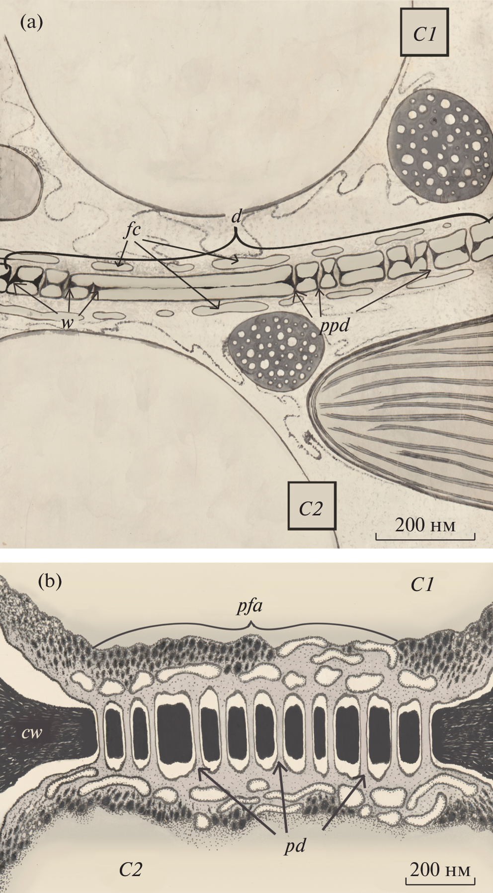 The present review outlines the history of the study of plasmodesmata in brown algae, describes their ultrastructure, which differs from that of other groups of algae and land plants, presents variants of localization of plasmodesmata in different members of Phaeophyceae – from a scattered location to arrangement into pit fields; the functions performed by plasmodesmata in the thalli of brown algae are listed. Possible prospects for further study of these structures are specified.