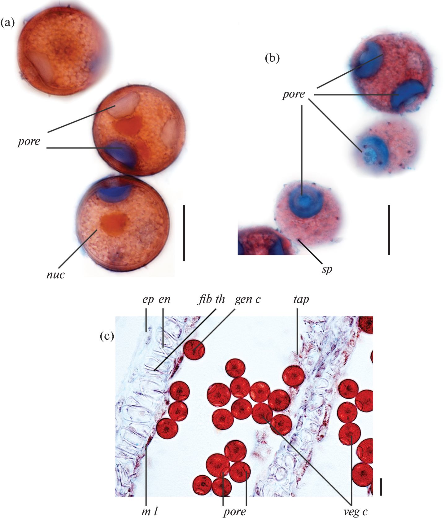 A cytoembryological study of the formation of microsporangium wall and the development of pollen grains in Campanula alliariifolia Willd. was carried out. A significant similarity in the structure of male embryonic structures in this species with the other representatives of Campanulaceae was revealed, namely: simultaneous formation of tetrads of microspores, bicellular pollen grains with relatively large vegetative cell, cellular secretory tapetum, bilayered endothecium. Characteristic features of this species are as follows: the absence of placentoids which indicates its evolutionary advancement, since the placentoids are characteristic of the most primitive representatives of the family; long-term, in comparison with previously studied species of the family, preservation of the tapetum, namely up to the opening of the anther, in the form of a cord of deformed tapetal cells located in a row and tightly adjacent to each other; relatively late appearance of fibrous bands.
