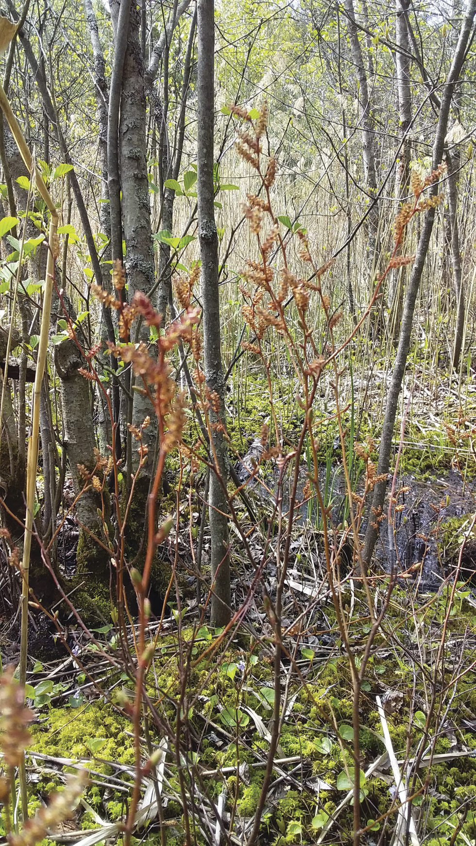 Субпопуляция Б (рис. 2). Произрастает в понижении за второй дюнной грядой в низинном мезо-евтрофном болоте, облесенном по краевым кочкам ольхой черной и березой пушистой. Восковник присутствует как в облесенной, так и в болотной зоне, частично заходя до центра последней. На освещенных участках он демонстрирует высокий виталитет (высота растений 1.0–1.4 м, покрытие 40%). Резко преобладают мужские растения, но встречаются и единичные женские. Cреди травянистых растений наблюдается чередование доминирования Phragmites australis (10–40%) и Eriophorun vaginatum (5–30%), а также Carex acuta (5–20%), C. elangata (5%), Viola epipsela (5%), Comarum palustre (5%), Menyanthes trifoliate (2%), Calla palustris (2%), Naumburgia thyrsifolia (1%) и др. В облесенной части – Alnus glutinosa (4–6 м), Betula pubescens (до 8 м), Pinus sylvestris (7–8 м) и Salix cinerea (до 3 м). В напочвенном покрове произрастают Phragmites australis (40%), Carex rostrata (10%), Carex elangata (10%), Eriophorun vaginatum (3%), Calla palustris (2%), Agrostis canina (2%), Dryoptheris cartusiana (2%), Comarum palustre (1%). Из мхов на обоих участках преобладает Sphagnum squarosum и Sphagnum centrale.
