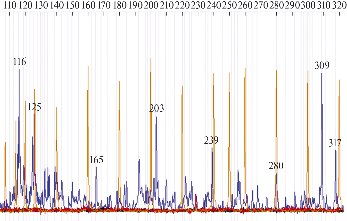 Проведение фрагментного анализа (AFLP). Один микролитр каждого анализируемого ПЦР-продукта, содержащего флуоресцентную метку, разводили в 10 раз в деионизированной воде. К 1 мкл разведенного амплификата добавляли 10 мкл Hi-Di формамида (Applied Biosystems, США) и 1 мкл стандарта молекулярного веса CD-450 (“Синтол”, Россия). Затем образцы денатурировали при +95°С в течение 5 мин и помещали на лед. Электрофорез образцов проводили с помощью генетического анализатора ABI3500xL (Applied Biosystems, США). Для анализа амплифицированных фрагментов использовали программное обеспечение Genemarker, Version 1.85 (SoftGenetics, LLC, США).