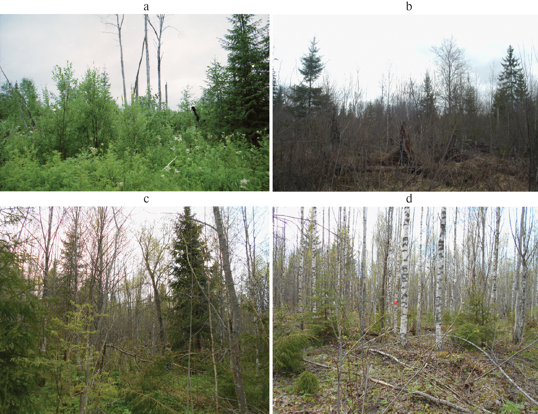 В Центрально-Лесном заповеднике (ЦЛЗ) нами были получены данные по развитию подроста ели европейской (Picea abies (L.) H. Karst.) в разреженных спелых ельниках, в “окнах”, на участках сплошных ветровалов, в молодняках на зарастающих полянах (Pukinskaya, 2006, 2009, 2020). Данные по развитию подроста ели на гарях в южнотаежной подзоне фрагментарные.