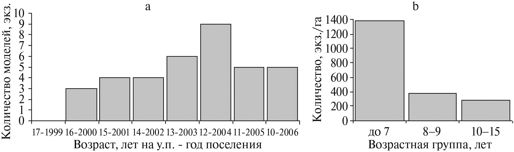При подтвержденной гипотезе о нормальности выборочного распределения (W-тест Шапиро-Уилка, на у.п.: W = 0.93201, p = 0.56812; на у.г.: W = 0.94635, p = 0.65008) отличия начальных приростов елей старшей (n = 7 на у.п., n = 15 на у.г.) и младшей (n = 9 на у.п. и n = 16 на у.г.) возрастных групп достоверны (t–критерий Стьюдента, t = 2.89 и 4.91 соответственно; рис. 4). Таким образом, начальные приросты старшей и младшей возрастных групп предварительного елового подроста на гари достоверно отличаются на у.п. и на у.г.