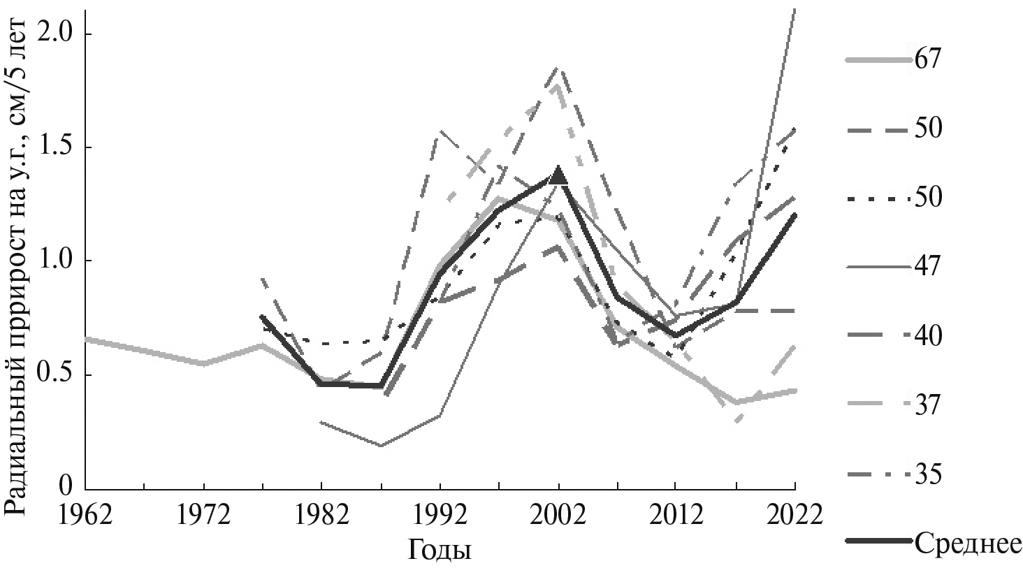Кривые хода роста также позволяют судить о происхождении древостоя. Предварительное возобновление реагирует на открытие полога синхронным скачком прироста. При этом после сплошного вывала средние приросты (за 5–10 лет) увеличиваются сразу, а после гари – приросты сперва резко снижаются и только спустя 5–10 лет увеличиваются. Подрост ели последующего возобновления на гари характеризуется довольно большими средними начальными приростами на у.п. (1.4–1.7 мм/год), а на у.г. – приростами, характерными для подроста ели под березняком (2.5 мм/год).