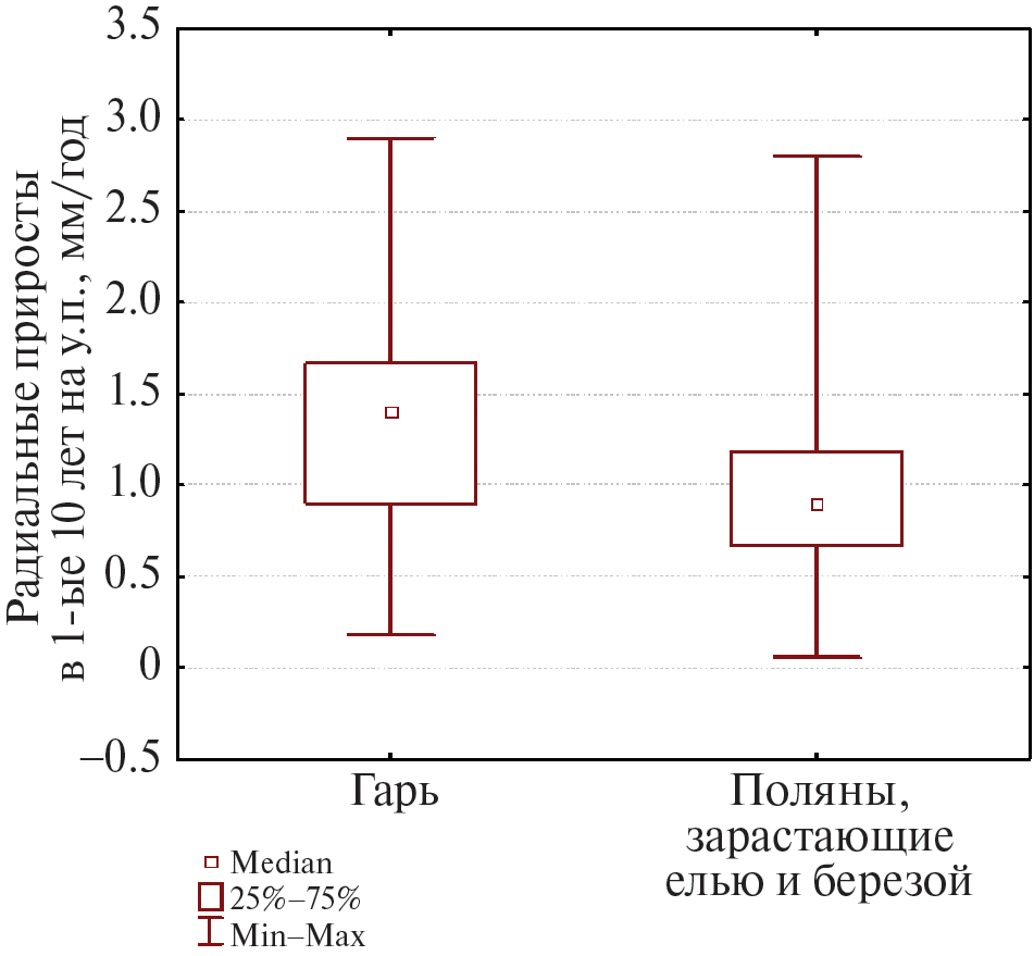Сравнивая начальные радиальные приросты на у.п. и на у.г. елей предварительного и последующего возобновления на гари с елями, выросшими в других сходных лесорастительных условиях, в отсутствие полога леса (табл. 3), можно сказать следующее. На гари и на полянах, зарастающих елово-лиственным лесом, приросты сходны. В обоих случаях ель засевается на открытом месте, а затем развивается под пологом мелколиственных пород. Тем не менее начальные приросты на у.п. (1.4 мм/год на гари, 0.9 мм/год на полянах) достоверно отличаются (рис. 5, табл. 3).