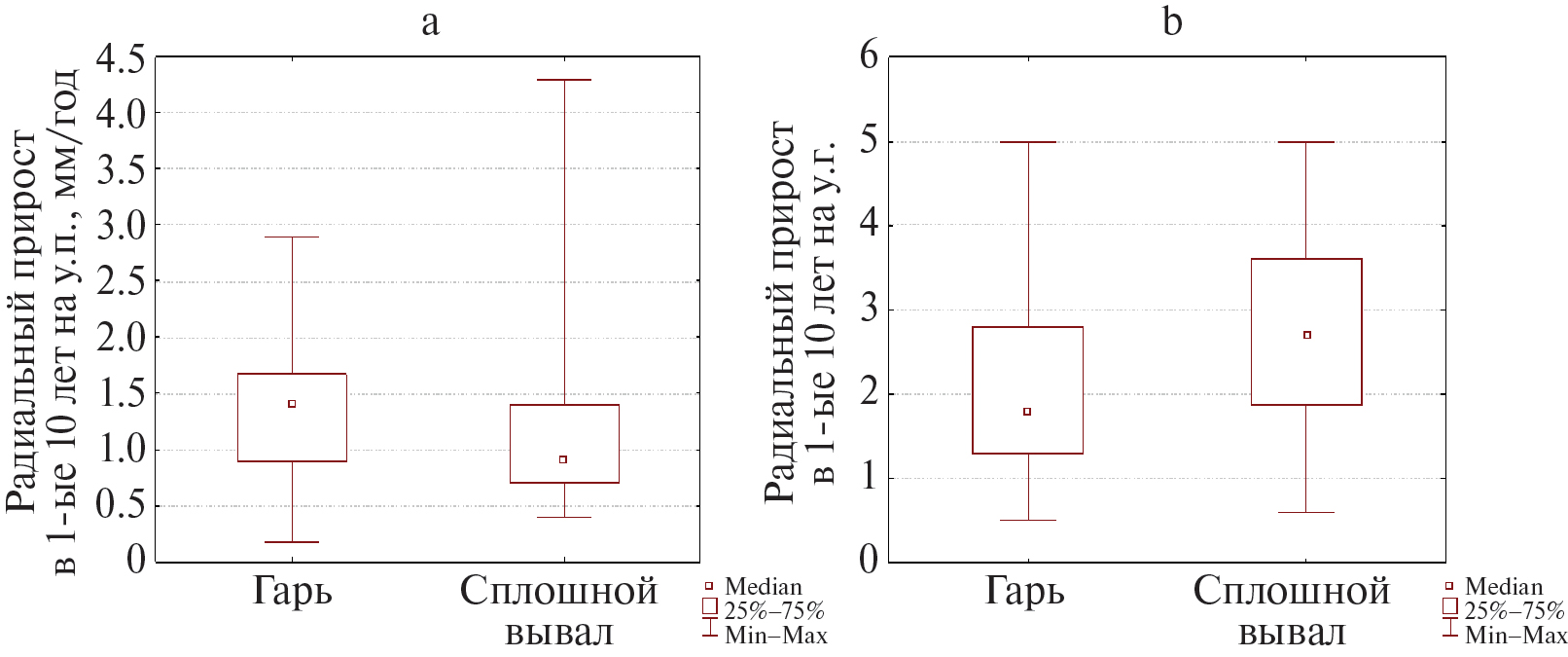 Рис. 6. Сравнение начальных радиальных приростов на у.п. (а) и на у.г. (b) елового подроста на гари и на сплошных вывалах (без разделения на предварительный и последующий).