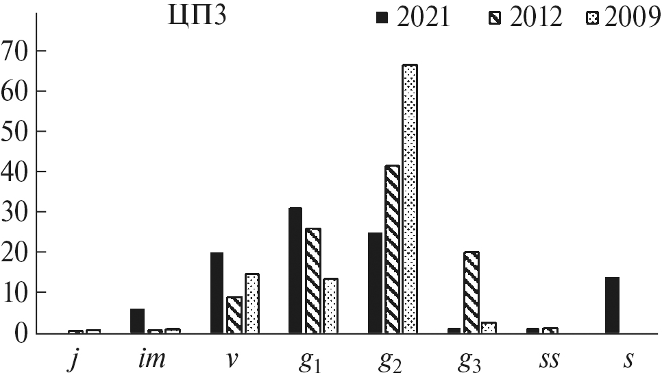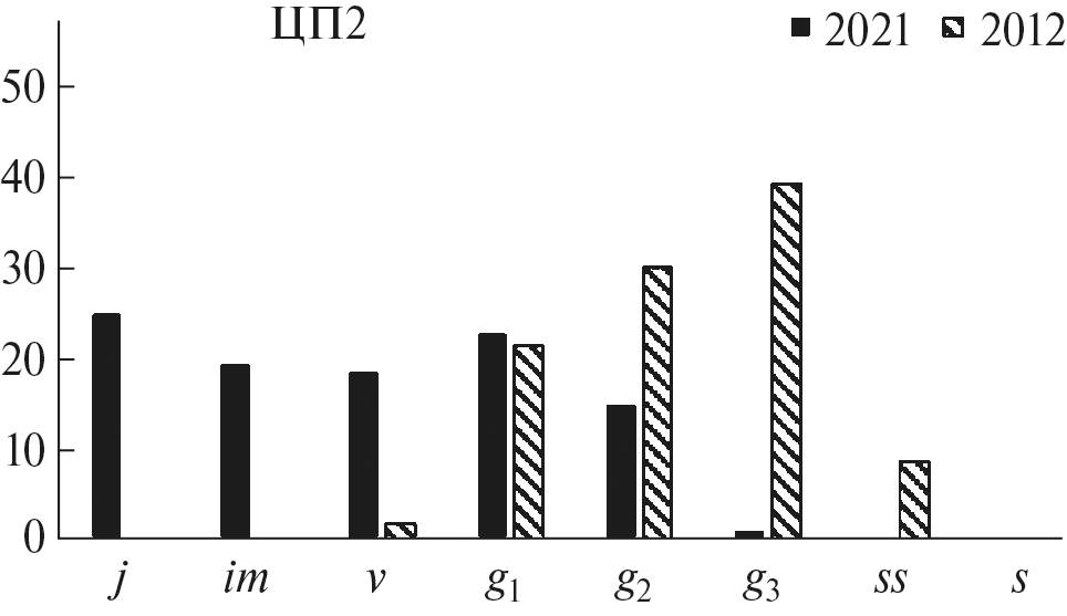 В ценопопуляции 2 за 9 лет тип онтогенетического спектра изменился с правостороннего на левосторонний (рис. 2). В 2012 г. спектр правосторонний, отсутствуют особи ювенильного и имматурного состояний, низкая доля виргинильных растений (1.8%), подъем числа особей в молодом и зрелом генеративных состояниях с пиком на старом генеративном состоянии и снижение численности растений постгенеративного периода. В 2021 г. спектр левосторонний с большой долей (от 18.2 до 24.6) молодых особей (j, im, v и g1) и снижением числа растений зрелого (14.7%) и старого (0.9%) генеративных состояний, отсутствие особей постгенеративного периода.