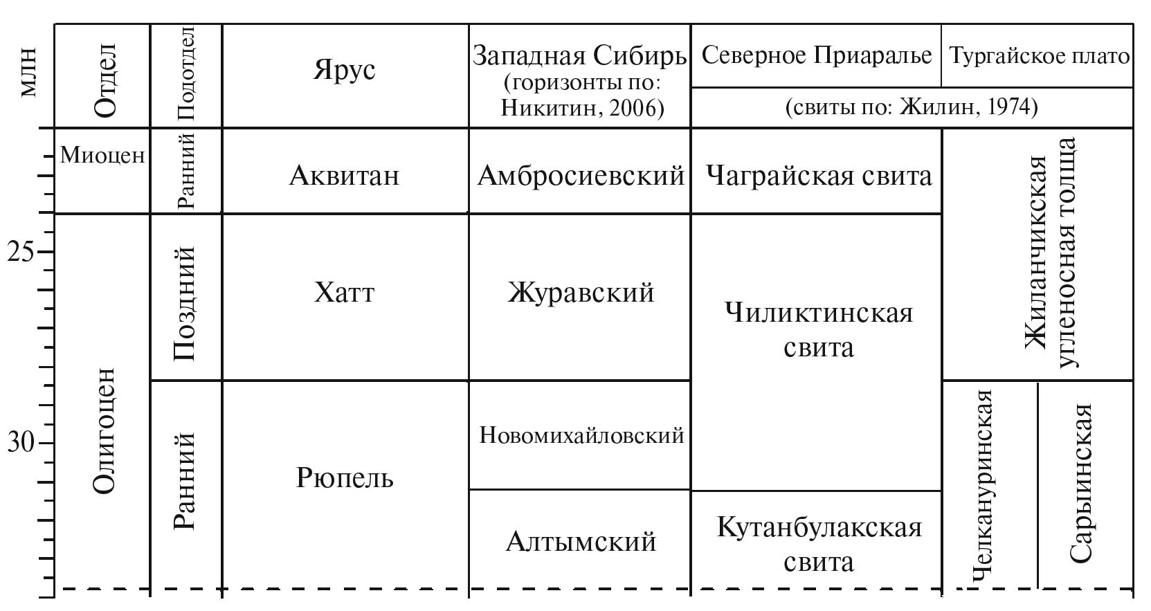 Рис. 2. Региональная стратиграфическая схема миоцена и олигоцена