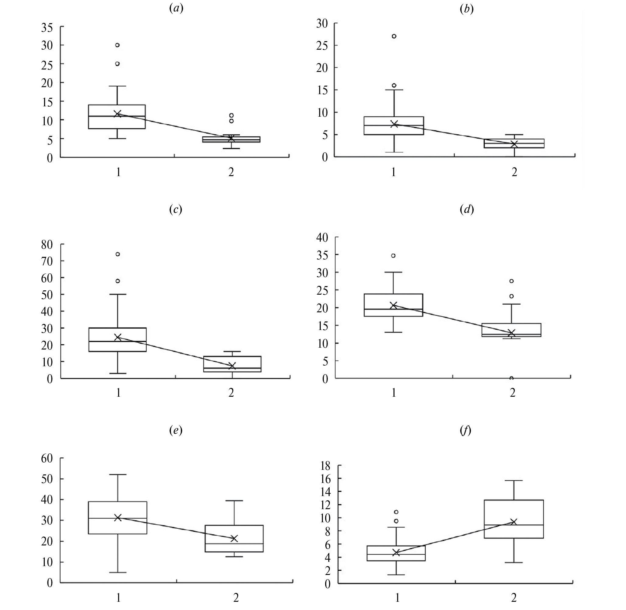 По оси X – 1 – нарушенные степи на песчаных почвах с наличием камней и низким увлажнением (ЦП 1–3); 2 – ненарушенная степь на супесчаной почве с умеренным увлажнением (ЦП 4); по оси Y – размах значений функционального признака; a – число вегетативных побегов на 1 составную скелетную ось, шт.; b – число генеративных побегов с паракладиями, шт.; c – число паракладиев, шт.; d – число цветков в паракладиях, шт.; e – число цветков в главном соцветии, шт.; f – длина вегетативного побега, см. Значения критерия Манна–Уитни (U) варьировали от 3.7 до 12.3 при p < 0.05.