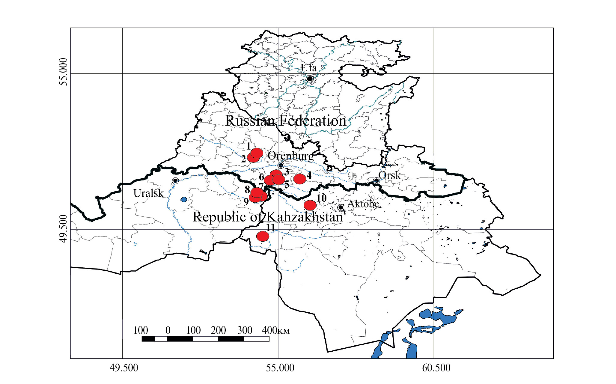 Исследование популяций вида осуществлялось в трех районах Южного Предуралья Оренбургской области (ОО) (Переволоцкий, Акбулакский, Соль-Илецкий) и двух районах на территории Республики Казахстан (РК) (Хобдинский, Уилский) в 2016–2020 гг., в общей сложности на протяжении примерно 400 км. В результате были выявлены и изучены 11 ценопопуляций (ЦП) R. tetraspis. Ценопопуляции названы по ближайшим к ним населенным пунктам или географическим объектам. Для выявления типа сообществ, в которых произрастает данный вид, выполнялись геоботанические описания, затем определялось их положение в существующей системе синтаксонов (Yamalov, 2012).
