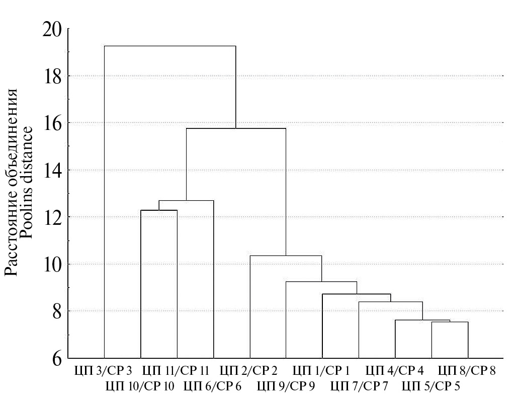 Рис. 2. Дендрограмма различий выборок Rindera tetraspis по средним морфометрическим параметрам растений.