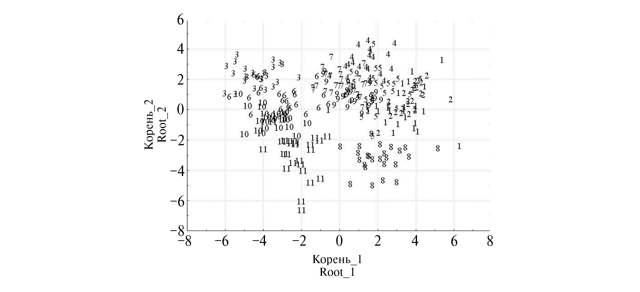 Рис. 3. Результаты дискриминантного анализа ЦП Rindera tetraspis по совокупности морфометрических признаков (1–11 номера ЦП).