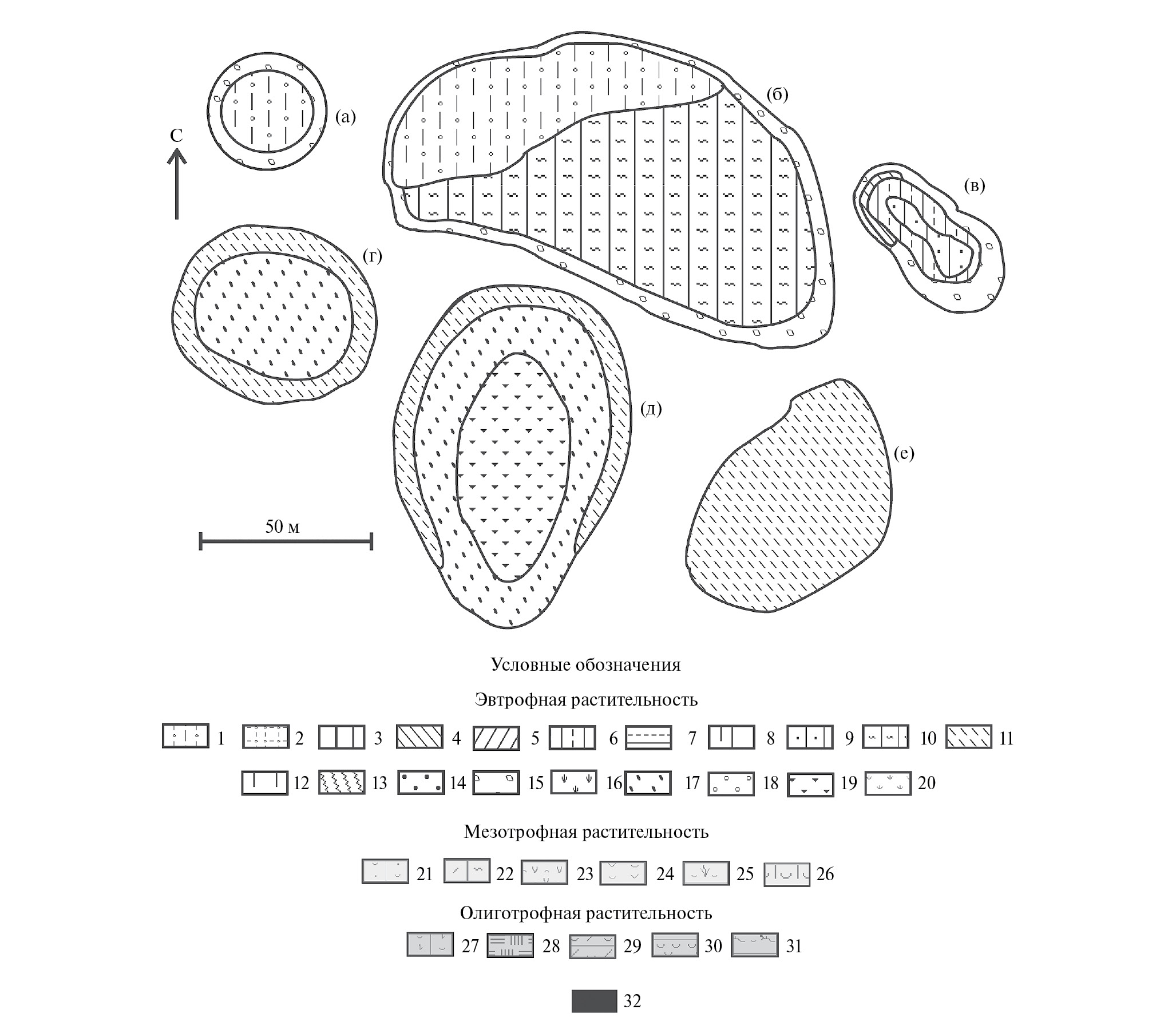 Для характеристики структуры растительного покрова модельных болот северной части Среднерусской возвышенности применяли картографический метод. Легенда карт построена с учетом классификационной схемы растительности модельных болот. При этом растительные сообщества были отнесены, в соответствии с условиями водно-минерального питания, к эвтрофной, мезотрофной и олиготрофной группам (см. табл. 1).