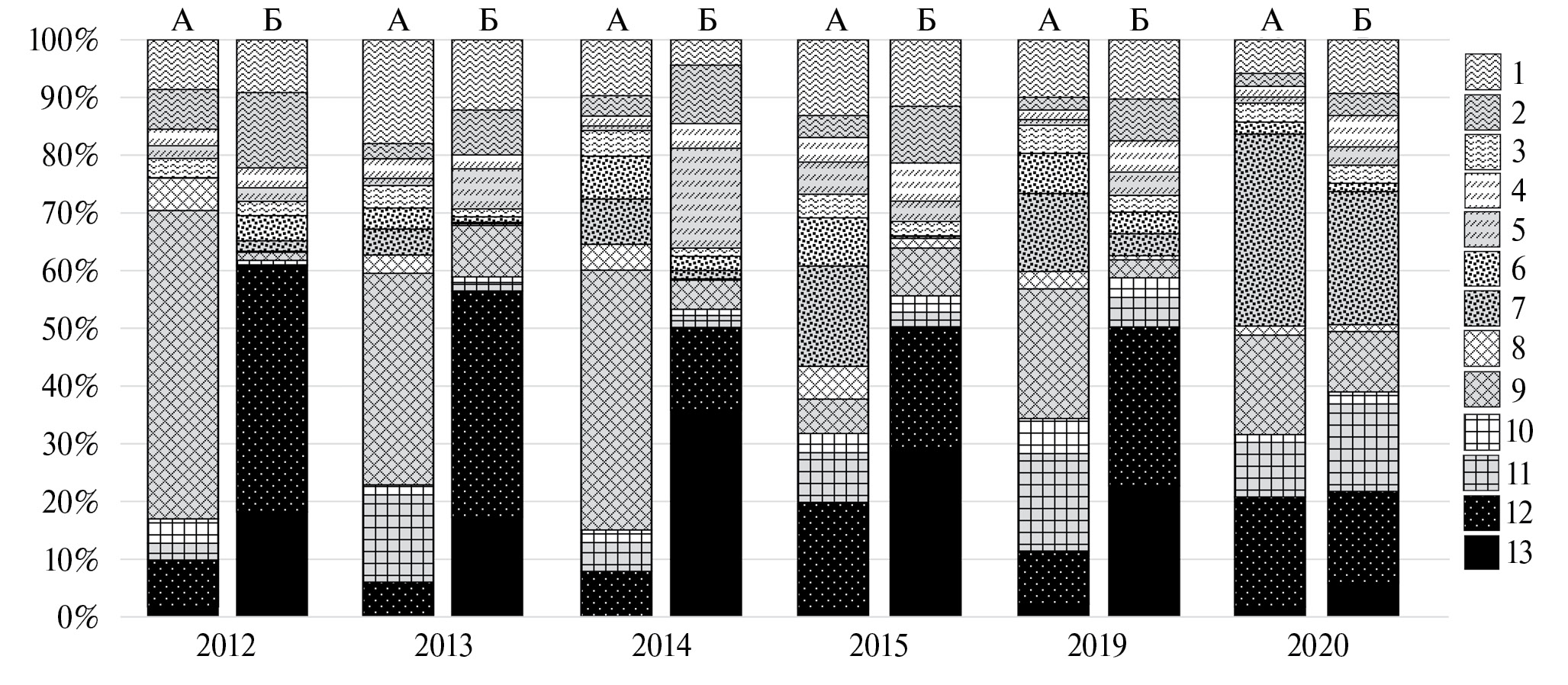 Восстановление структуры торфогенного слоя на участке Б происходит медленно в относительно сухой период (2012–2018), зато переувлажнение 2019 г. резко меняет картину: в следующем 2020 г. соотношение фракций участка Б (см. рис. 3) уже не так сильно отличается от А, хотя структура последнего подверглась достаточно сильным изменениям.