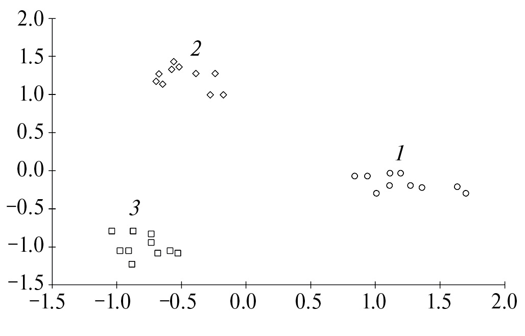 По оси X – первая главная компонента, по оси Y – вторая главная компонента; 1 – обоеполые; 2 – пестичные; 3 – тычиночные цветки.