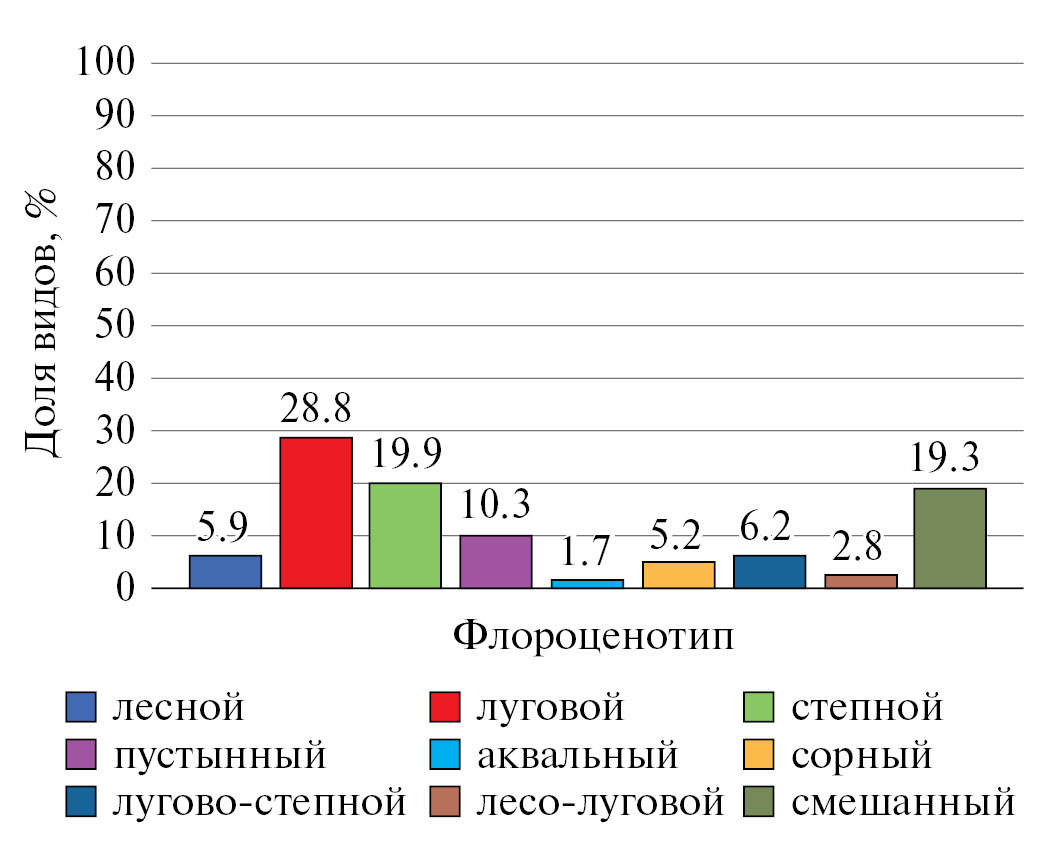 Для эколого-ценотического анализа использована несколько измененная схема флороценоэлементов и флороценотипов А.Л. Иванова (Ivanov, 2019), который объединяет выделенные им флороценоэлементы во флороценотипы в понимании Р. В. Камелина (Kamelin, 1973). На исследуемой территории нами использовано 6 флороценотипов: лесной, луговой, степной, пустынный, аквальный и сорный. А.Л. Иванов (Ivanov, 1998) включает в пустынный флороценотип виды степных сообществ, распространенных на локальных выходах глин, песков и известняков (кальцепетрофильный, псаммофильный, оксилофильный, аргиллофильный), т. е. в эдафических вариантах горных степей. Луговой флороценотип включает три типа флороценоэлементов (равнинный, субальпийский и альпийский); сорный флороценотип включает два флороценоэлемента: рудеральный и сегетальный. Виды, приуроченные одновременно к лесным и луговым сообществам, объединены нами в переходный лесолуговой флороценотип; виды, отнесенные А.Л. Ивановым (Ivanov, 2019) одновременно к степному и луговому флороценоэлементам, собраны нами в переходный луговостепной флороценотип. Прочие виды, встречающиеся в фитоценозах нескольких типов растительности, выделены в группу “смешанный” флороценотип.