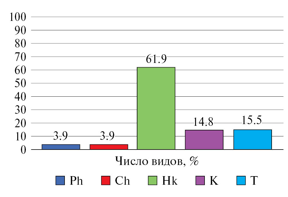 По биоморфологическому спектру видов сообщества степей региона КМВ характеризуются преобладанием гемикриптофитов. Высокий процент участия видов лугового флороценотипа в спектре основных групп биоморф, а также несколько сниженная доля участия терофитов в составе изучаемых сообществ косвенно свидетельствуют о существенном вкладе сообществ луговых степей в фитоценотическое разнообразие региона. В структуре жизненных форм по системе И.Г. Серебрякова (Serebryakov, 1962, 1964) доминируют корневищные поликарпические травы. При этом большая доля стержнекорневых трав (как поликарпиков, так и монокарпиков) отражает факт широкого распространения под степными ценозами исследуемого региона сухих типов почв, в том числе каменистых и щебнистых субстратов. Многообразие и сложный спектр жизненных форм в составе степных сообществ района КМВ объясняются наличием комплекса различных местообитаний региона исследований.