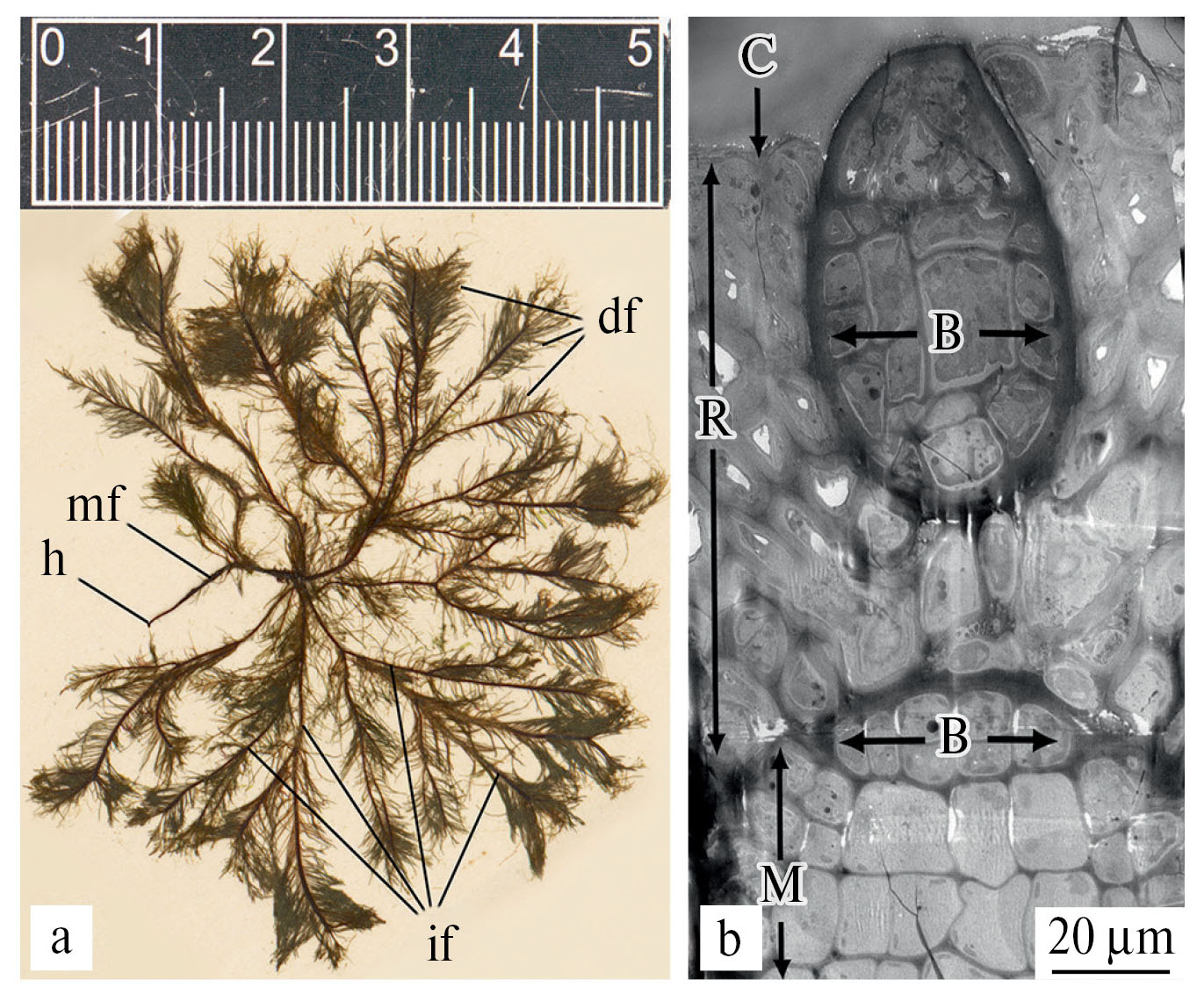 Рис. 1. Строение Chaetopteris plumosa: a. Общий вид таллома: mf – основная нить; if – ветви неограниченного роста; df – ветви ограниченного роста; h– подошва (базальный диск); b. Поперечный срез средней части таллома: M – сердцевина; R – ризоидальная кора; C – кутикула; B – ветви.