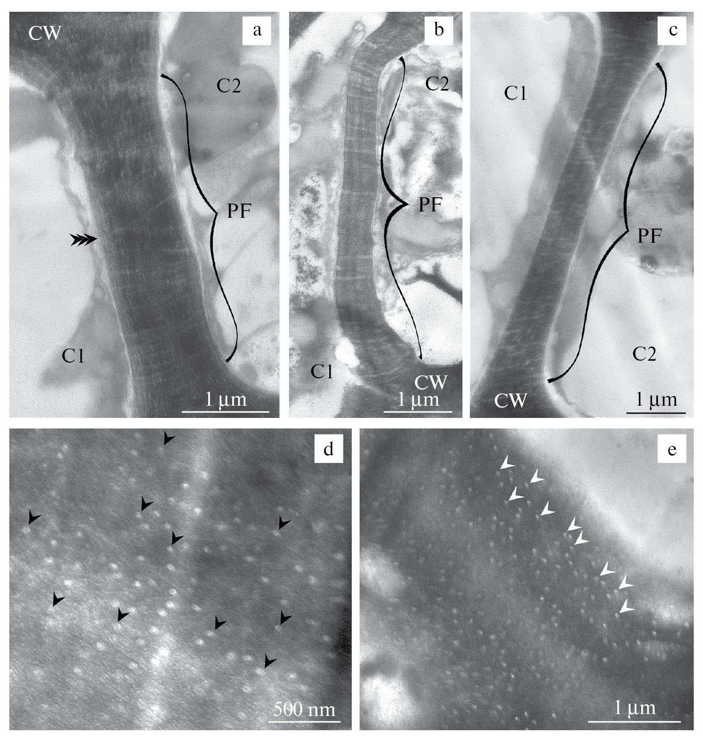Рис. 3. Поровые поля в клеточных стенках Chaetopteris plumosa: a, b, c. Поровые поля в продольном разрезе; тройной стрелкой обозначена плазмодесма, которая выглядит разветвленной; d, e. Поровые поля в поперечном разрезе; стрелками обозначены плазмодесмы; CW – клеточная стенка; PF – поровое поле; C1, C2 – клетки на срезах.