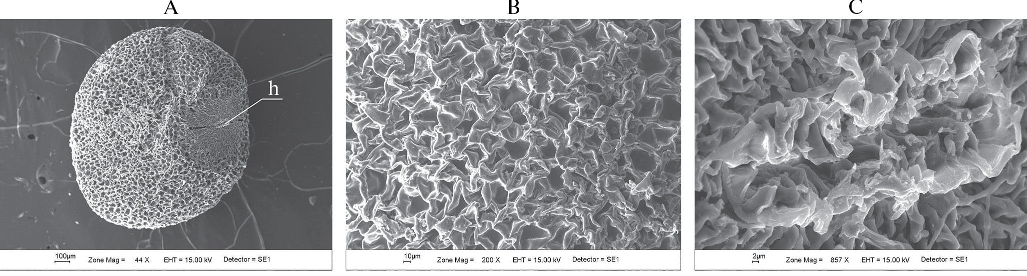 Fig. 1. Seed of Cuscuta japonica. A – general view of the seed from the ventral side, B – exotesta cells on the ventral side of the seed, C – fragment of the seed hilum; h – seed hilum.