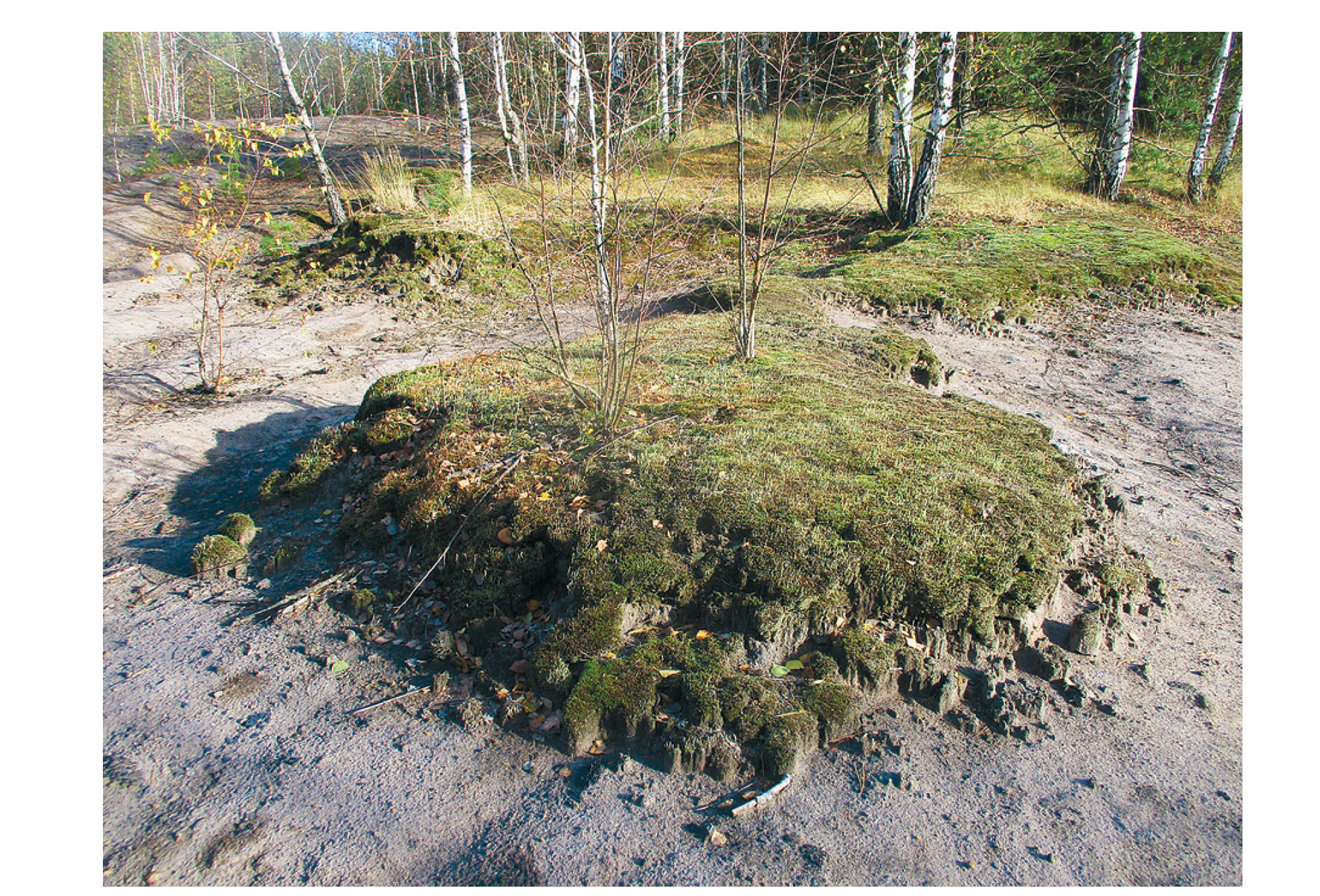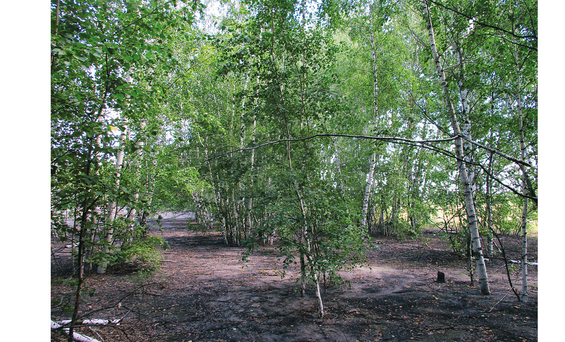 Шлейфы делювиально-пролювиальные (рис. 5) – располагаются по периферии террикона и формируются в результате оползней и размыва грунта с его поверхности. Здесь, как правило, представлены разреженные березняки, реже вейниковые и хвощовые группировки. Авторы, изучающие первичные сукцессии на угольных отвалах ПБУБ (Lednev et al., 2020), считают, что на делювиальных шлейфах стадия водорослей, мохообразных и лишайников не выражена ввиду высокой чувствительности указанных таксонов к химическому воздействию среды. Наши исследования показали, что отсутствие промышленной эксплуатации в течение 30–40 лет благоприятно сказалось на процессах восстановления, и мохообразные как пионеры зарастания на шлейфах присутствуют. Всего выявлено около 20 видов на угольных почвогрунтах и 3 вида на стволах берез. Индикаторами угольных грунтов являются массово развивающиеся ацидофильные эпигейные виды Endogemma caespiticia, Dicranella cerviculata, обильны также эвритопные космополиты Bryum argenteum, B. caespiticium, Ceratodon purpureus.