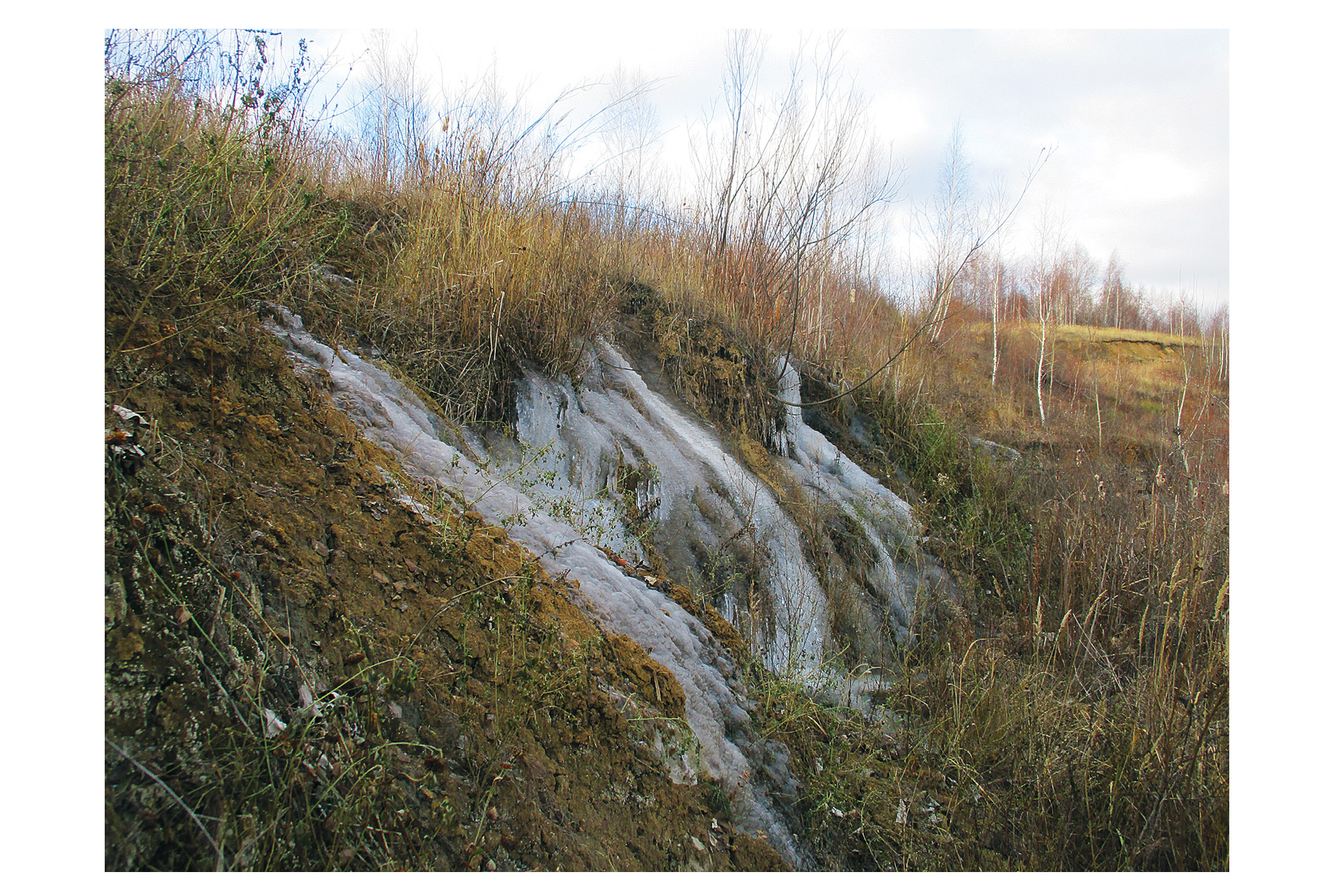 Ложбины стока (рис. 6) – формируются в результате активной водной эрозии в нижней части терриконов, прорезая и пологие участки шлейфов. Голые, зачастую влажные, стенки промоин иногда сплошь покрывают индикаторные виды Endogemma caespiticia, Dicranella cerviculata. Выявлено 7 видов, помимо указанных, здесь встречаются Barbula unguiculata, B. convoluta, Cephaloziella divaricata, Ceratodon purpureus, Leptobryum pyriforme. Ложбины стока по мере удаления от террикона трансформируются в овраги.