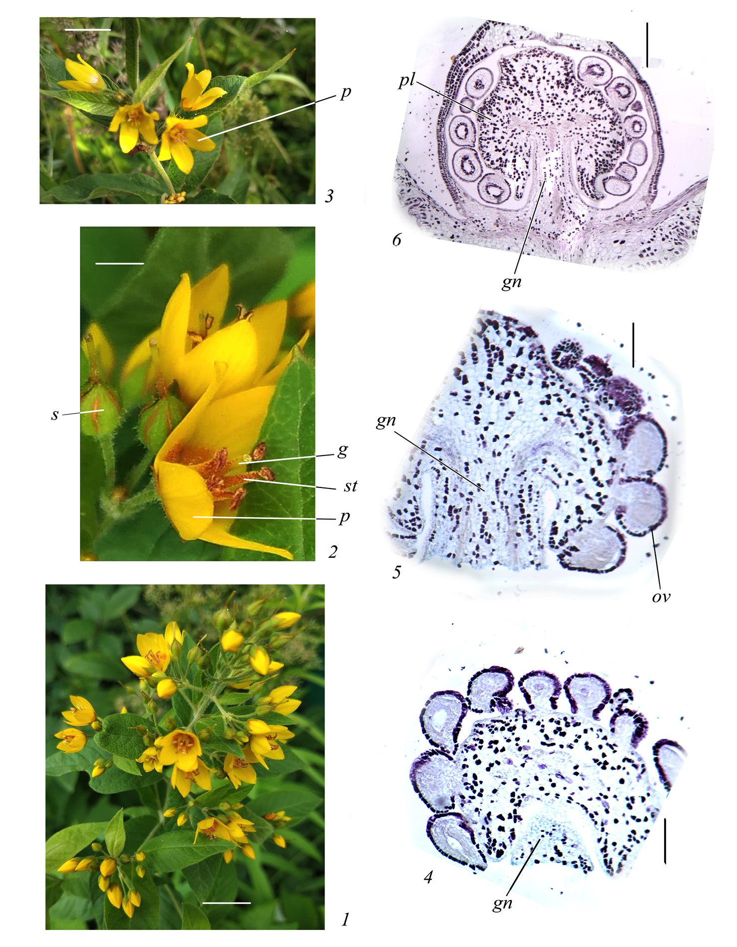 Рис. 1. Строение соцветия, цветка и гинофора у Lysimachia vulgaris ( 4–6 – продольные срезы) .