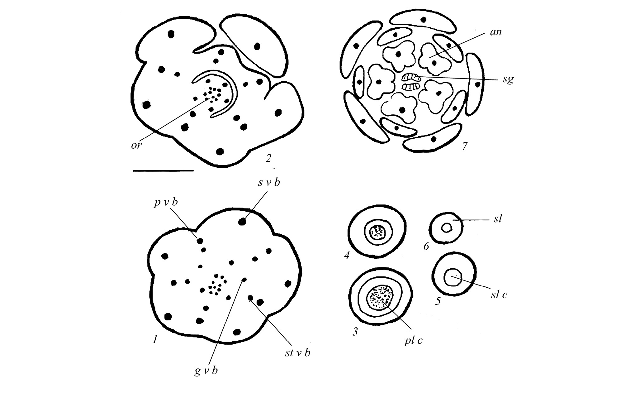1 – the structure of a developing flower bud, in its lower part all elements are combined into one structure; 2 – higher up, the flower elements begin to separate; 3–7 – the first signs appear of differentiation of the ovary with placentary column ( 2–4 ), the style with a channel ( 5, 6 ), and stigma lobes ( 7 ). an – anther, g v b – gynoecium vascular bundle, or – ovary, pl c – placentary column, p v b – petal vascular bundle, sg – stigma, sl – style, sl с – style channel, st v b – stamen vascular bundle, s v b – sepal vascular bundle.