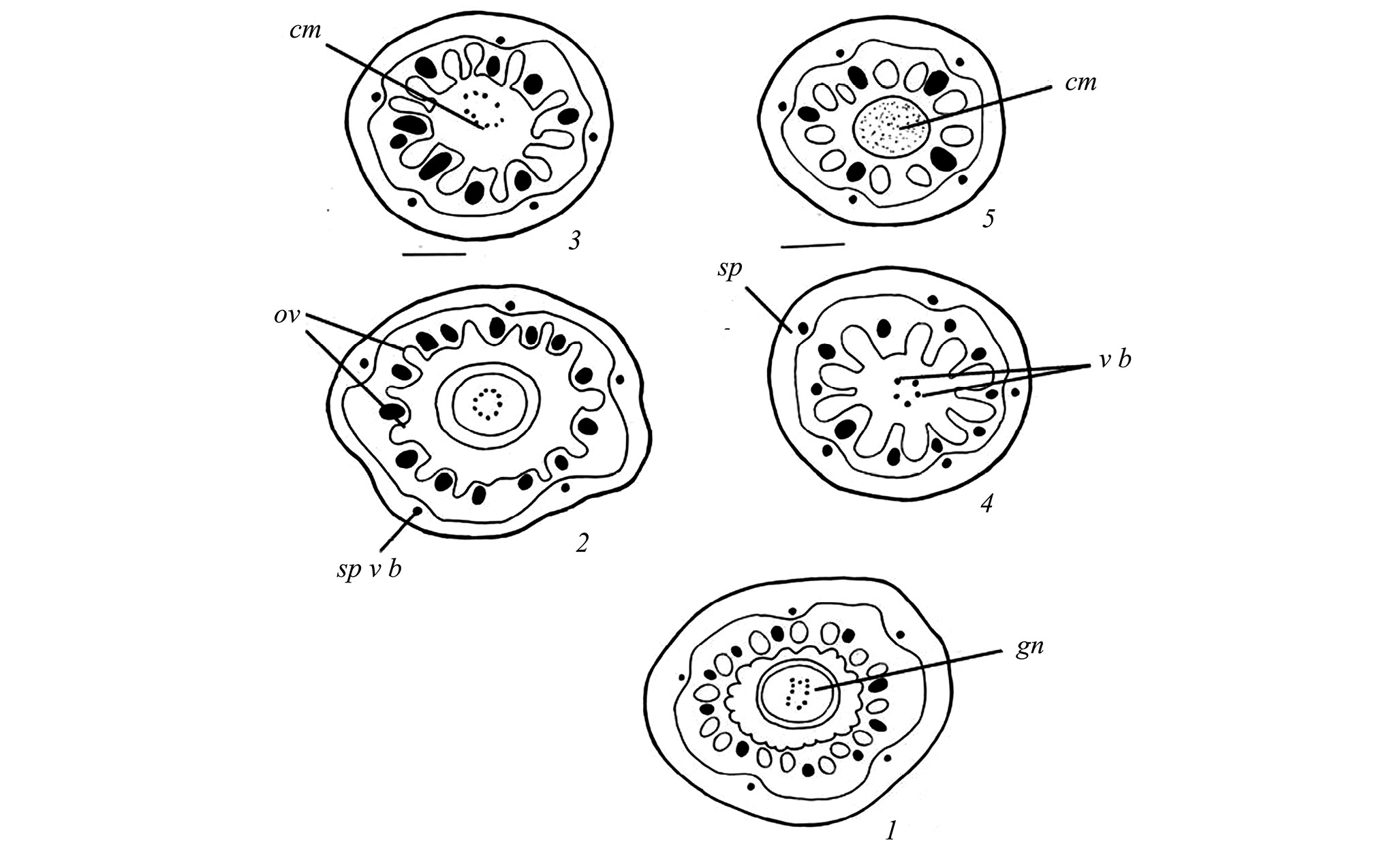 1, 2 – строение завязи в основании на уровне свободной части гинофора, в котором дифференцируются 7–10 проводящих пучков; 3, 4 – средняя часть завязи, в колумелле число пучков сокращается до 5 ( 4 ); 5 – верхняя часть завязи, пучки в колумелле исчезают совсем в ее закругленной области. cm – колумелла, gn – гинофор, ov – семязачаток, sp – септа, sp v b – септальный проводящий пучок, v b – проводящий пучок.