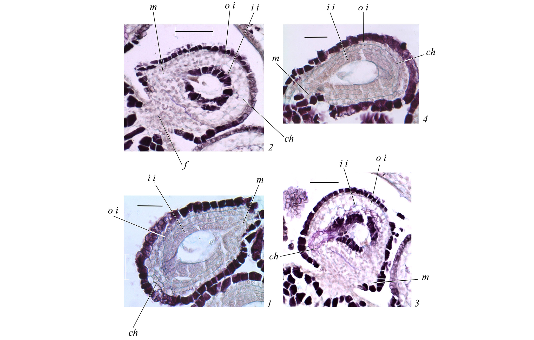 Scale bars, µm: 1, 3, 4 – 100, 2 – 50.