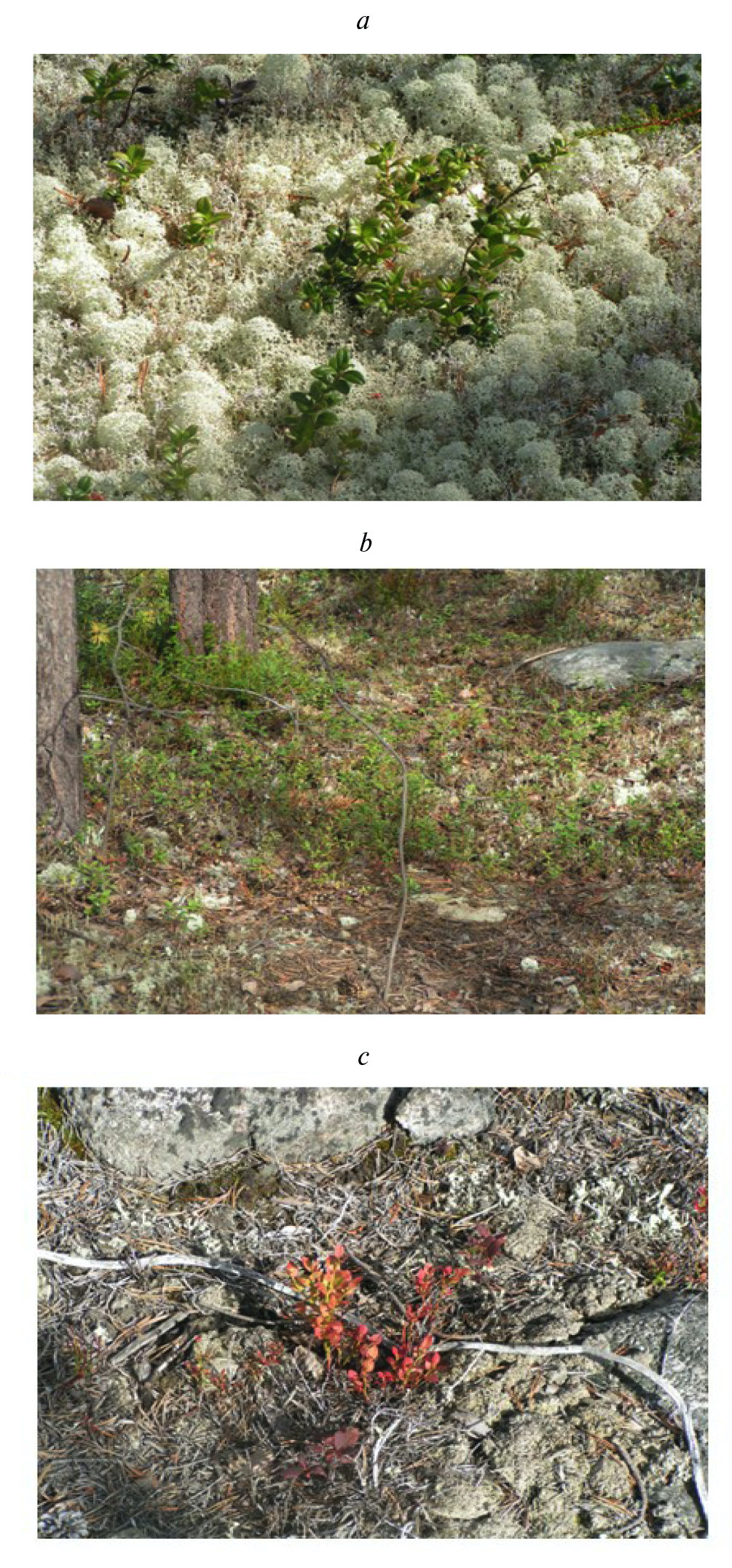 Рис. 1. Напочвенный покров исследуемых сосновых лесов в фоновом районе ( а ), буферной ( b ) и импактной ( c ) зонах.